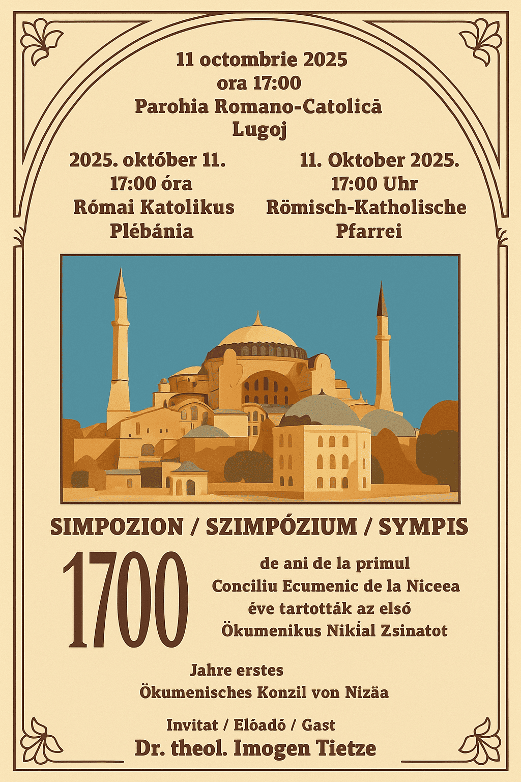 Invitatul principal al simpozionului este Dr. theol. Imogen Tietze, teolog catolic implicat în formarea pastorală și în activități dedicate dialogului ecumenic. Prezența sa aduce evenimentului un accent internațional și promite o perspectivă solidă asupra moștenirii Conciliului de la Niceea.