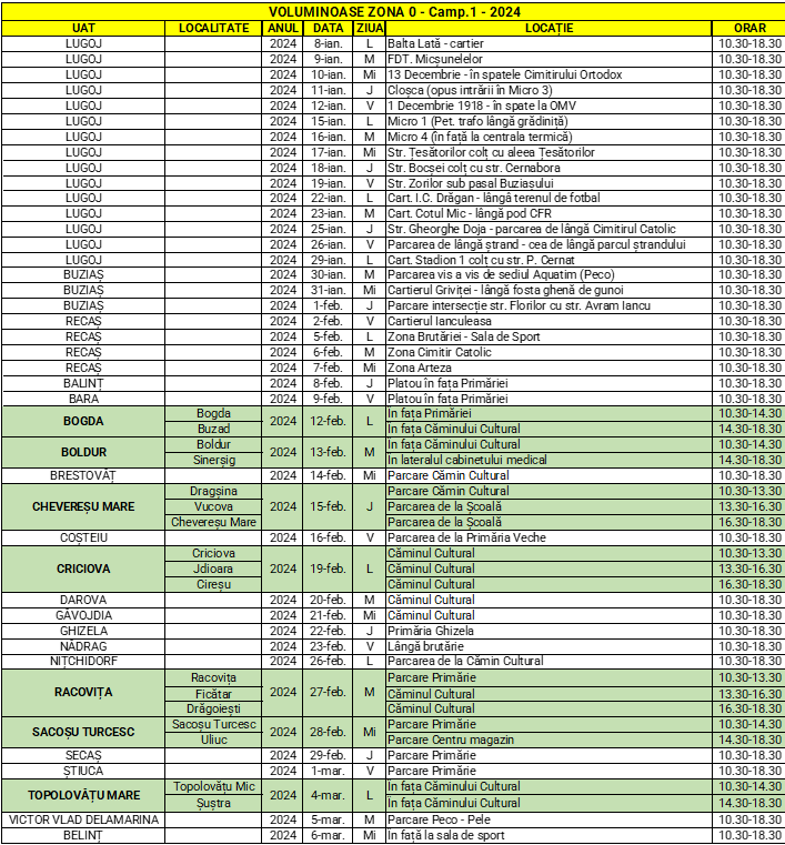 Cetățenii din localitățile menționate mai sus pot depune prin aport voluntar și gratuit deșeurile voluminoase în containerele special puse la dispoziție în punctele de colectare și între orele menționate în tabelul de mai jos.