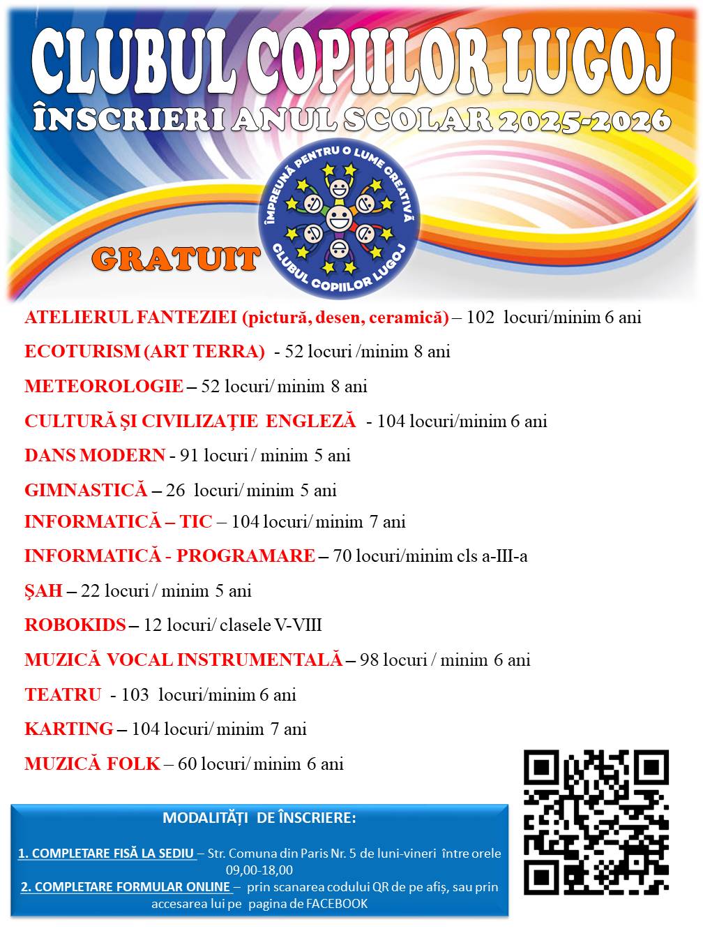 Clubul Copiilor Lugoj a dat startul înscrierilor pentru anul școlar 2025–2026, oferind elevilor și preșcolarilor oportunitatea de a participa gratuit la activități extracurriculare diverse, organizate în cadrul unor cercuri tematice coordonate de profesori cu experiență.