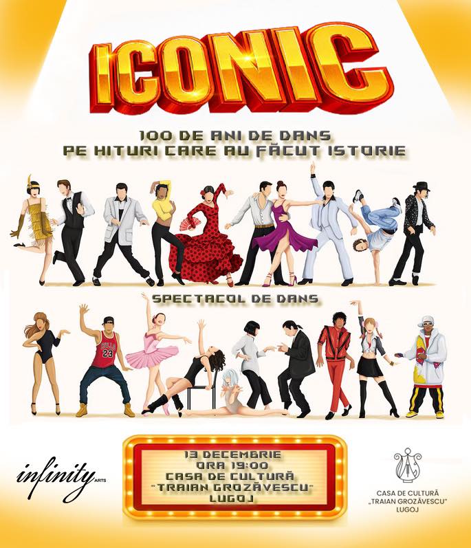 Infinity Arts Lugoj invită publicul la un eveniment special de final de an: spectacolul „ICONIC – 100 de ani de dans pe hituri ce au făcut istorie”. Evenimentul va avea loc pe 13 decembrie, de la ora 19:00, la Casa de Cultură „Traian Grozăvescu”.
