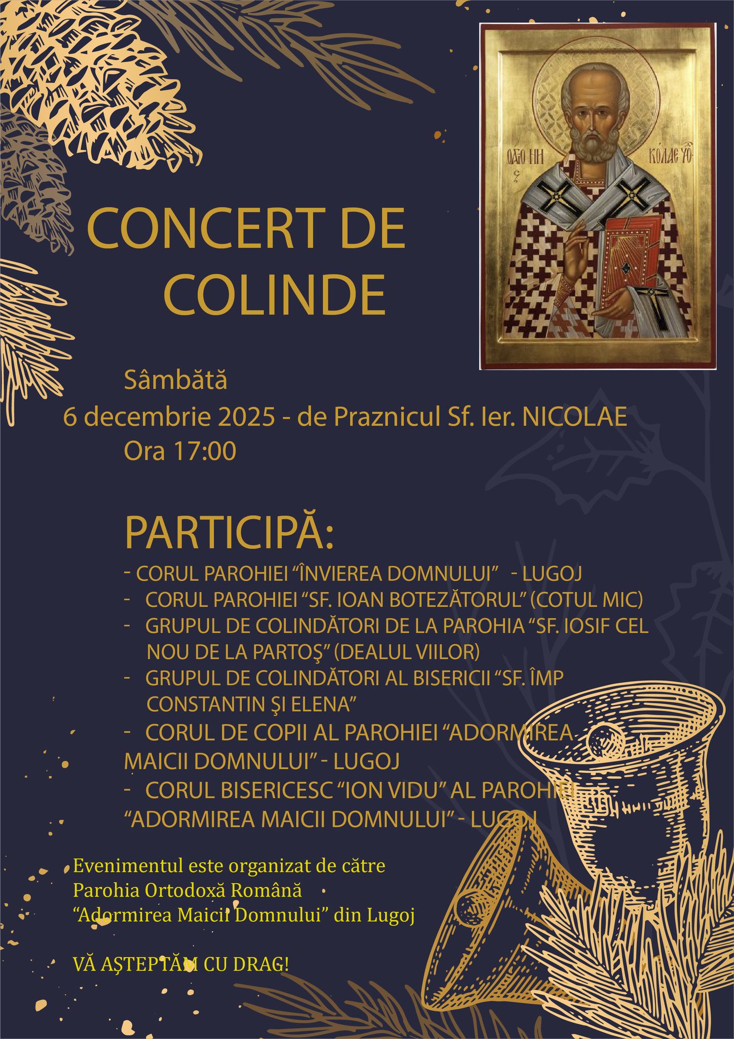 Lugojenii sunt invitați sâmbătă, 6 decembrie 2025, la un Concert de Colinde organizat de Parohia Ortodoxă Română „Adormirea Maicii Domnului” din Lugoj, cu ocazia Praznicului Sfântului Ierarh Nicolae. Evenimentul va începe la ora 17:00.