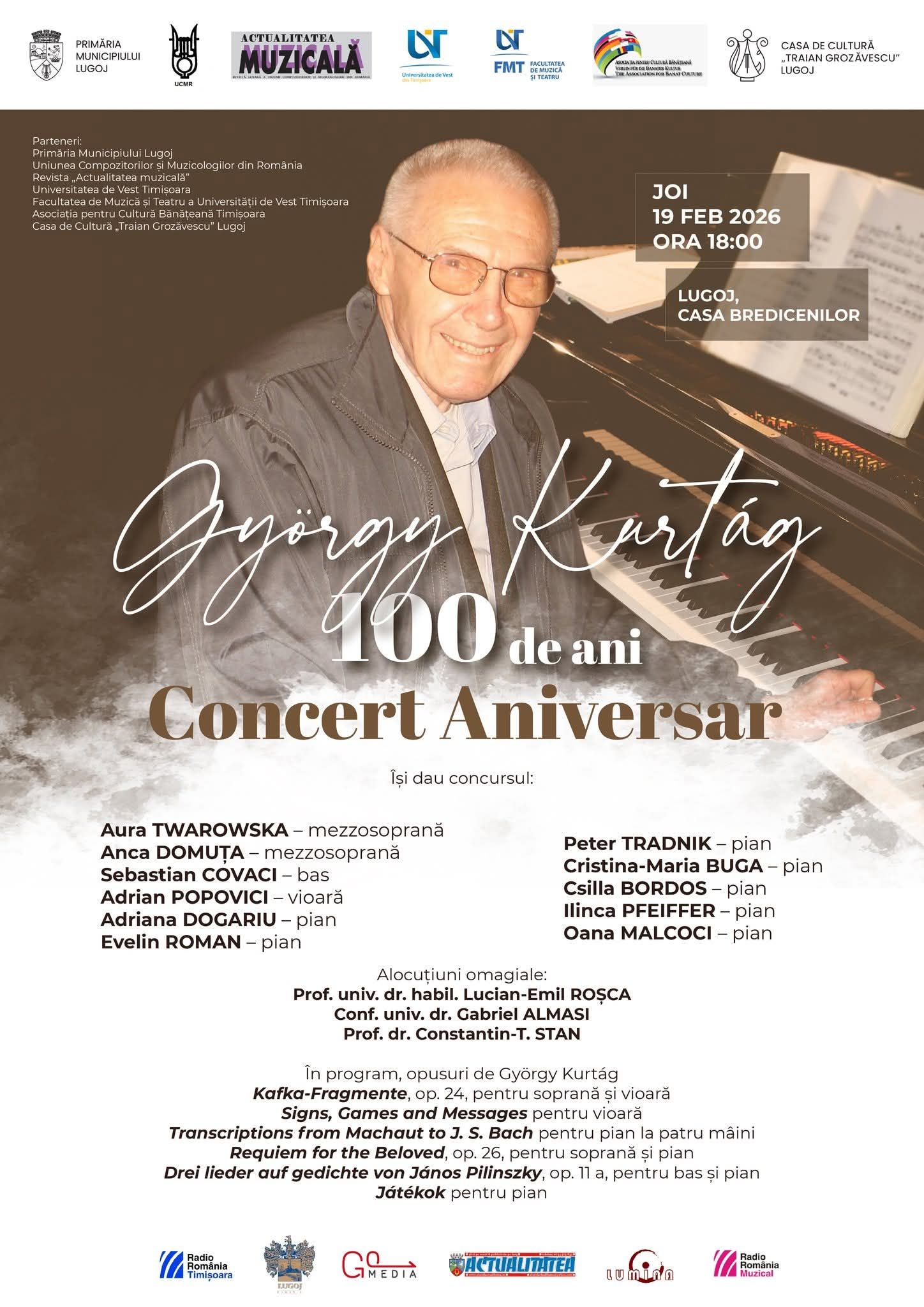 Lugojul marchează centenarul unuia dintre cei mai importanți compozitori ai muzicii contemporane: György Kurtág, născut în orașul de pe Timiș. Joi, 19 februarie 2026, de la ora 18:00, la Casa Bredicenilor, publicul este invitat la „Concert Aniversar – György Kurtág 100 de ani”, un eveniment dedicat creației compozitorului care împlinește 100 de ani chiar în ziua concertului.