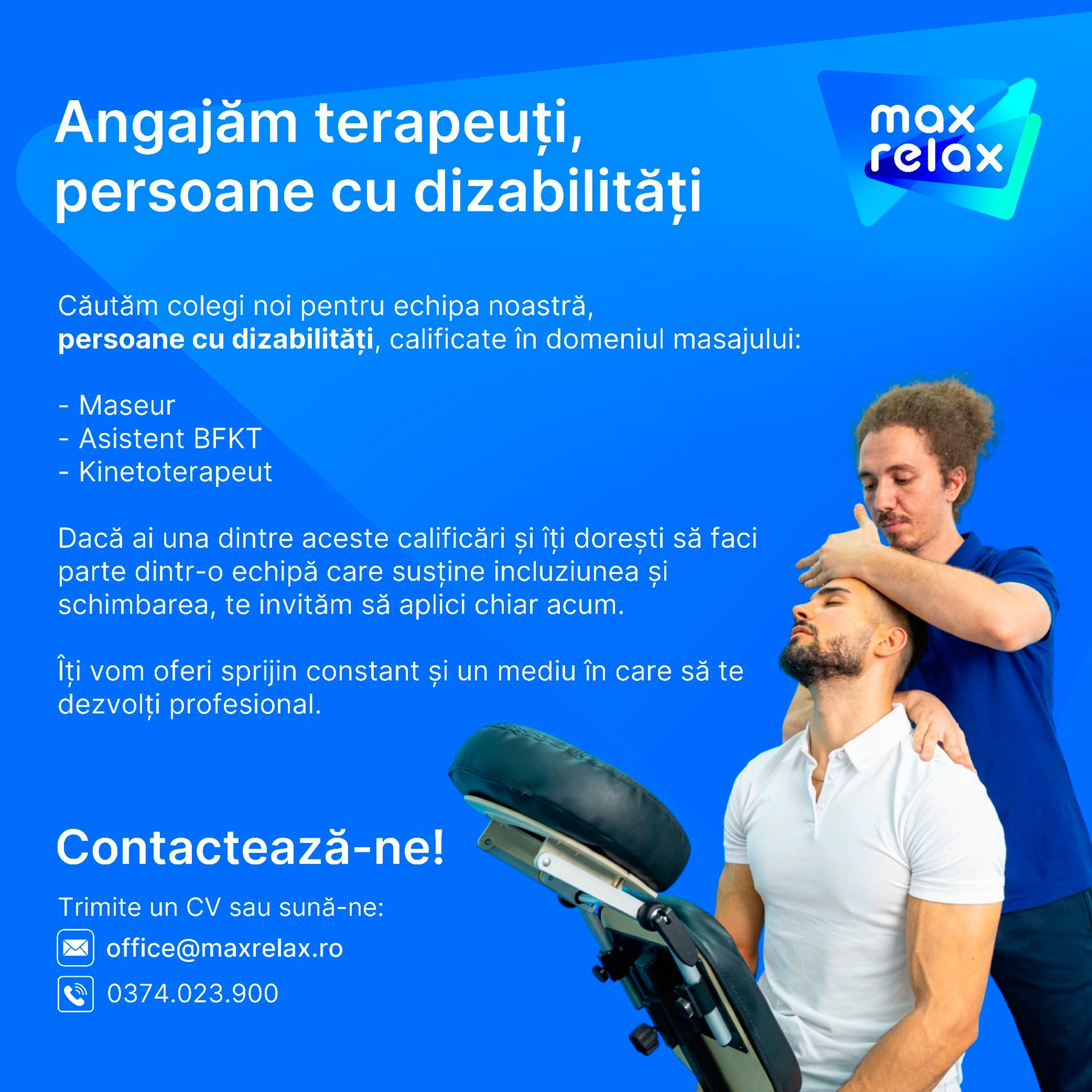 Compania Max Relax a anunțat că își extinde echipa și face angajări dedicate persoanelor cu dizabilități, inclusiv în Lugoj. Potrivit afișului de recrutare, sunt căutați colegi „calificați în domeniul masajului”, pentru următoarele poziții: maseur, asistent BFKT și kinetoterapeut.