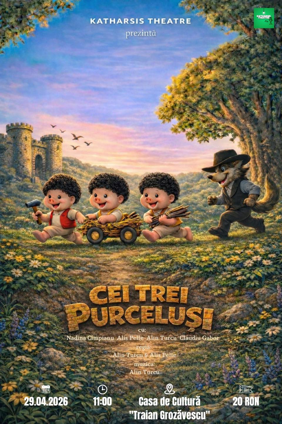 Dimineață plină de magie pentru copiii din Lugoj! Astăzi, 29 aprilie, de la ora 11:00, Casa de Cultură „Traian Grozăvescu” devine scena unei aventuri interactive de neuitat. Trupa Katharsis Theatre din Sibiu aduce în fața micuților spectacolul „Cei trei purceluși”, o reinterpretare modernă a poveștii clasice.