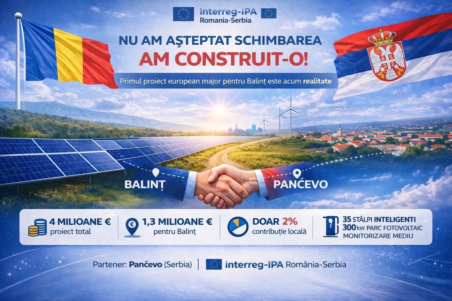 Finanțarea este obținută după un proiect scris de către administrația din Balinț, o premieră pentru zona de vest a țării, prin programul Interreg IPA România–Serbia, cu sprijin de la Vârșeț și Pančevo. Palierul găsit susține proiecte comune pentru protecția mediului, eficiență energetică și servicii publice moderne în comunitățile de frontieră. Pentru Balinț, acest proiect înseamnă investiții concrete: