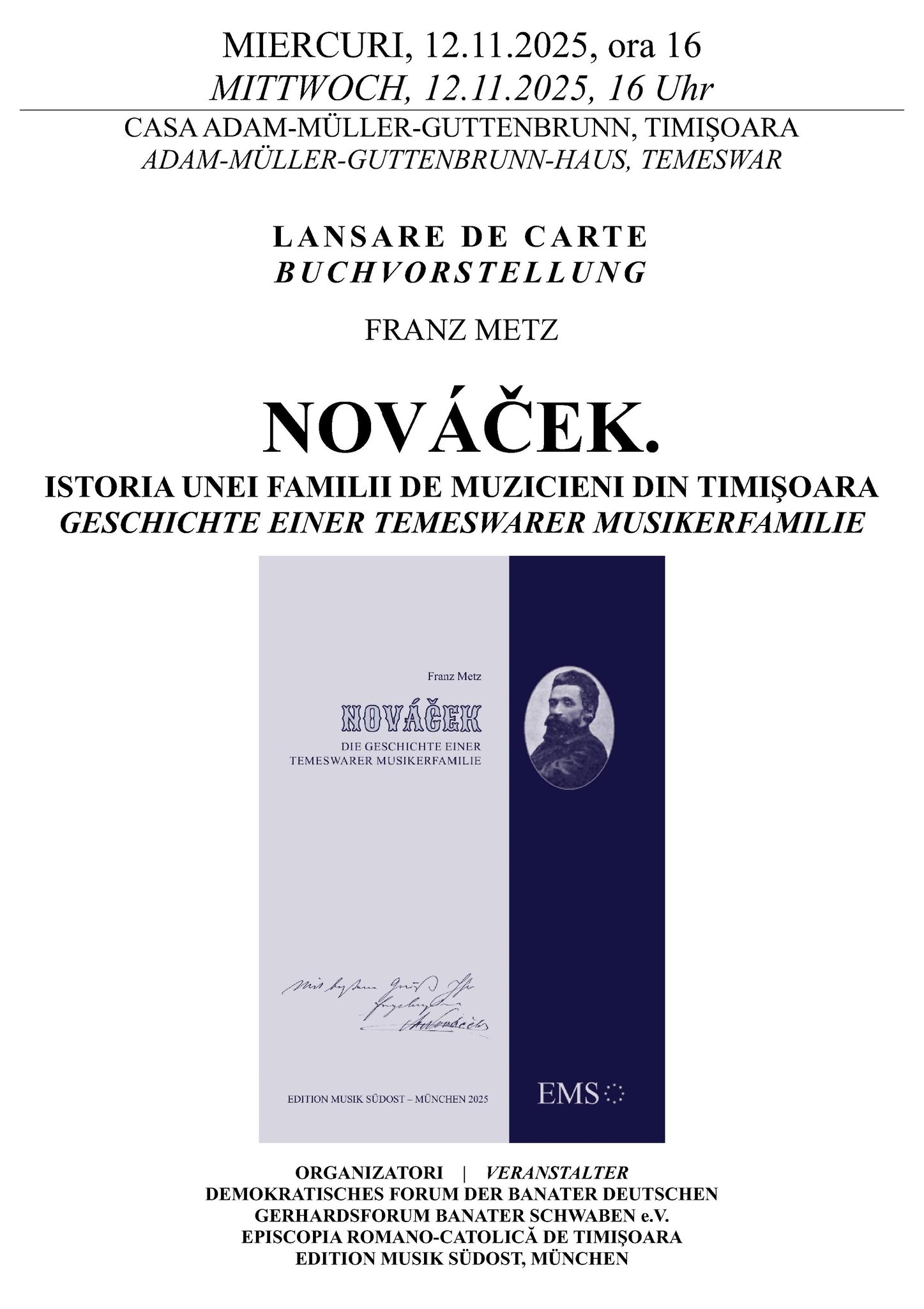 Miercuri, 12 noiembrie 2025, de la ora 16, la Casa Adam-Müller-Guttenbrunn din Timișoara va avea loc lansarea de carte a muzicologului Franz Metz, intitulată „Nováček. Istoria unei familii de muzicieni din Timișoara / Geschichte einer Temeswarer Musikerfamilie”. Evenimentul este organizat de Demokratisches Forum der Banater Deutschen, Gerhardsforum Banater Schwaben e.V., Episcopia Romano-Catolică de Timișoara și Editura Edition Musik Südost din München, unde volumul a fost publicat în 2025.