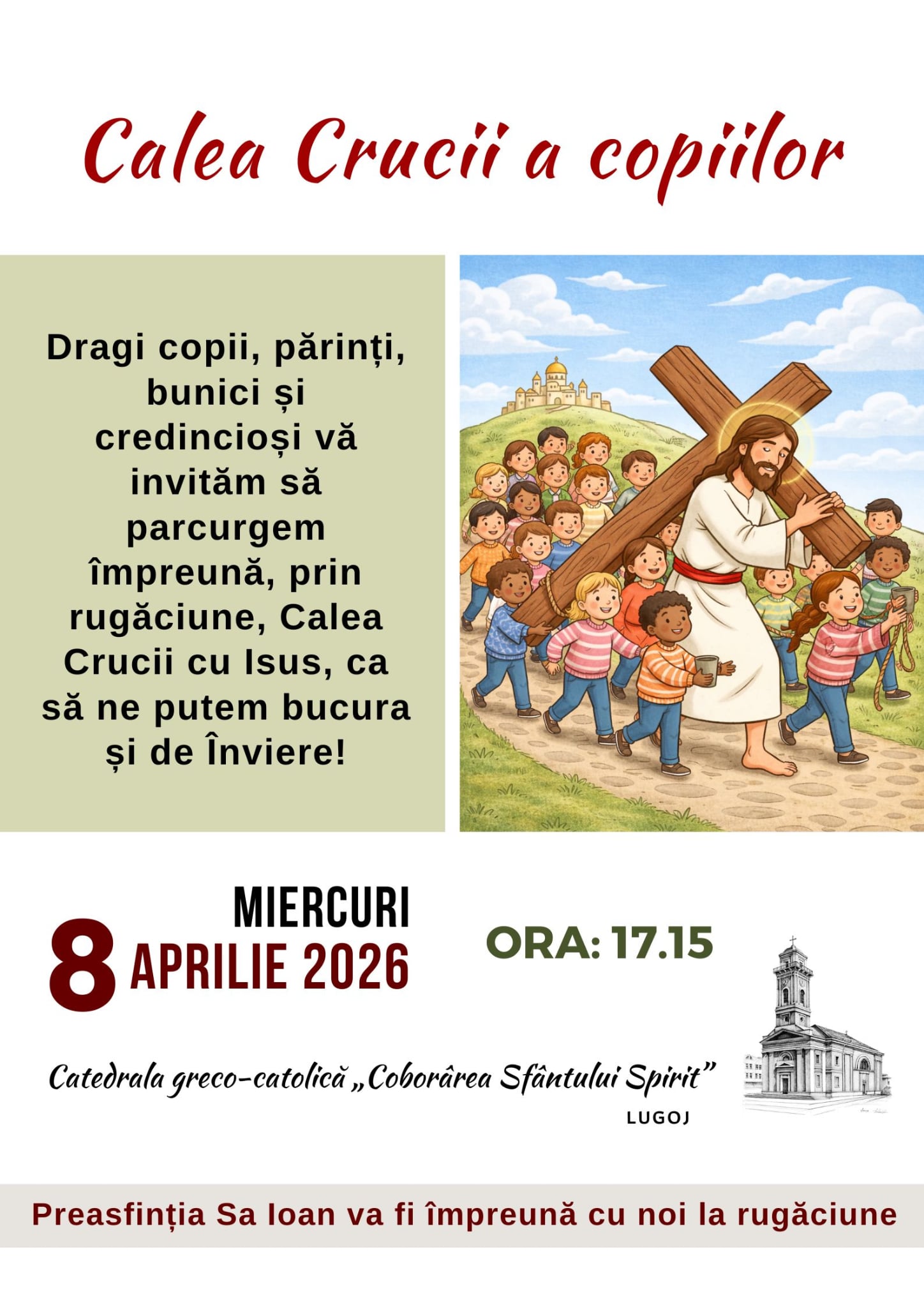 Comunitatea greco-catolică din Lugoj îi invită pe cei mai tineri credincioși, alături de familiile lor, la un eveniment spiritual deosebit. Miercuri, 8 aprilie, Catedrala „Coborârea Sfântului Spirit” va găzdui „Calea Crucii a copiilor”, o celebrare dedicată pregătirii pentru marea sărbătoare a Învierii.