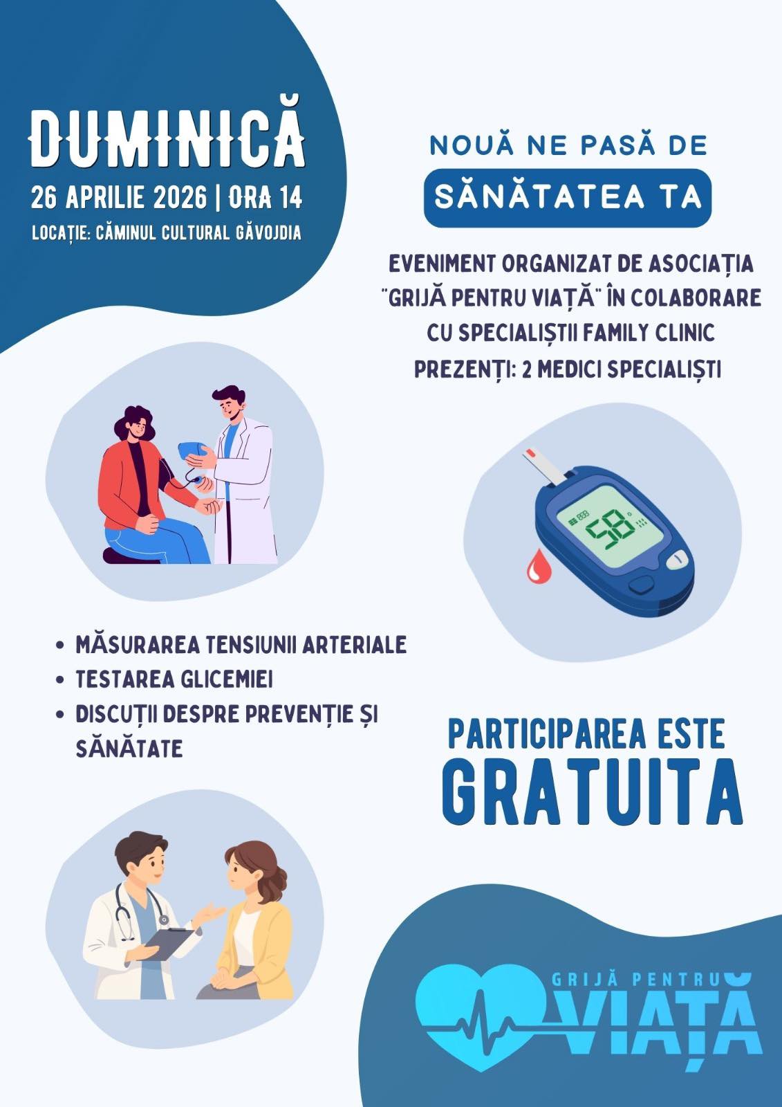 Sănătatea comunității revine în prim-plan printr-o inițiativă locală menită să faciliteze accesul cetățenilor la monitorizare medicală. Evenimentul, organizat de Asociația „Grijă pentru Viață” în parteneriat cu specialiștii de la Family Clinic, va avea loc la Căminul Cultural din Găvojdia, începând cu ora 14:00.