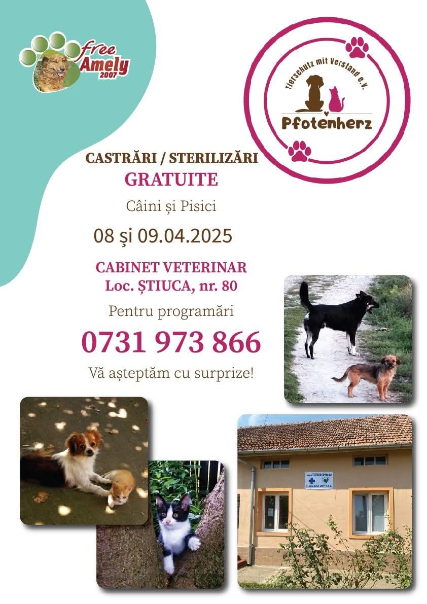 Asociația „Free Amely” din Lugoj anunță o nouă campanie de sterilizări și castrări gratuite pentru câini și pisici, cu și fără stăpân, desfășurată pe 8 și 9 aprilie 2025.