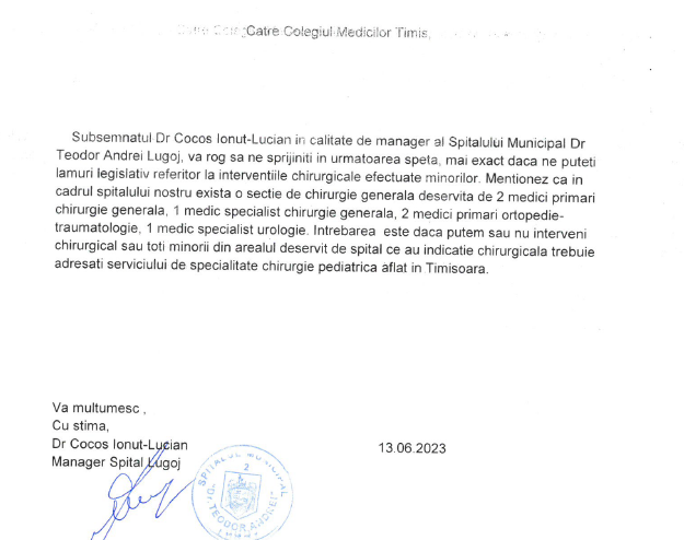 Astfel, într-o adresă transmisă către Colegiul Medicilor Timiș, managerul spitalului din Lugoj, dr. Ionuț Lucian Cocoș, cere „lămuriri legislative”, legate de condițiile în care chirurgii din Lugoj pot opera copii în unitatea lugojeană. Iată, mai jos, documentul:
