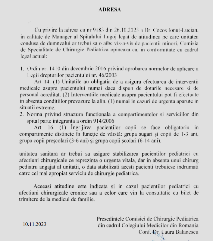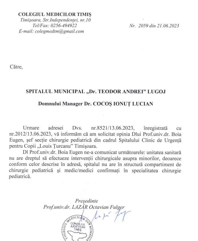 Răspunsul Colegiului Medicilor Timiș arată că, la Spitalul din Lugoj, nu pot fi operați copii: Iată, mai jos, documentul: