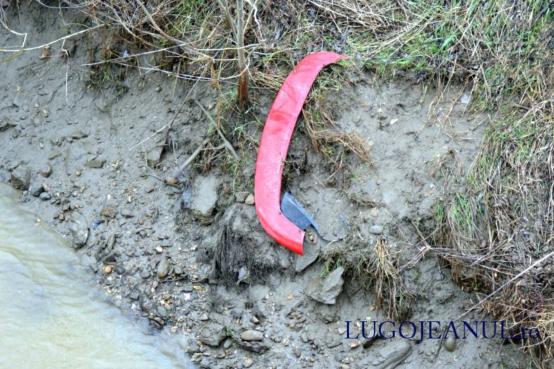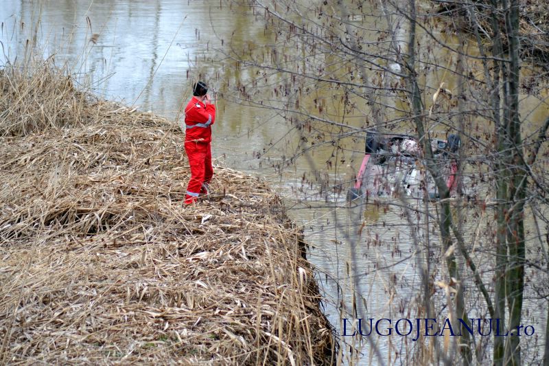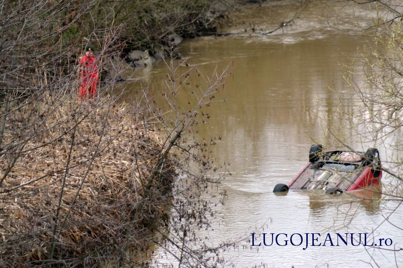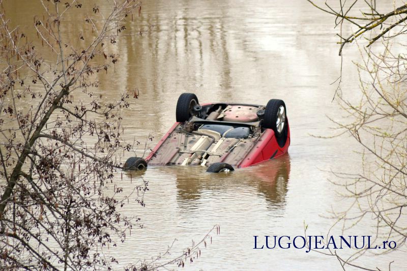 Cascadorie! Un șofer gorjean a prins apă sub roți și a sărit cu mașina în râul Bega la Coșteiu