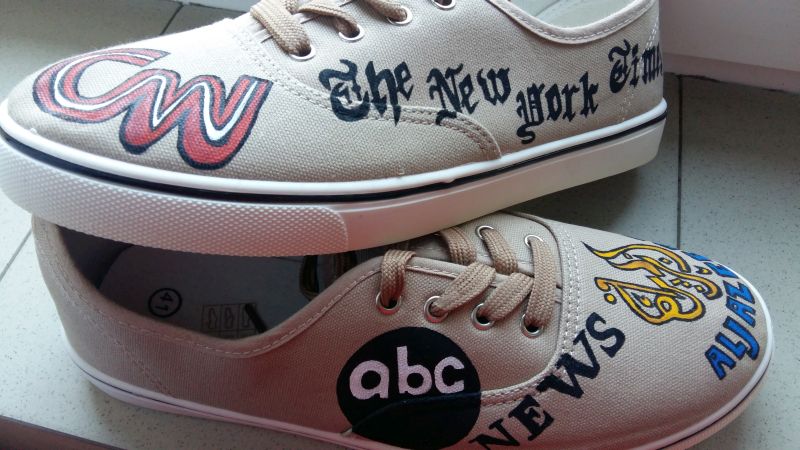 Talent, ar spune unii. Tenisii pe care ii face Lorena sunt exact ceea ce spuneam mai sus, un cadou care nu este nici scump, nici cu un logo renumit pe ei, insa inseamna ceva pentru tine, ceva ce iubesti si traiesti in fiecare zi. In cazul meu jurnalismul, pe tenisi fiind desenate siglele a patru dintre cele mai puternice produse media ale globului. Ge-ni-ali.