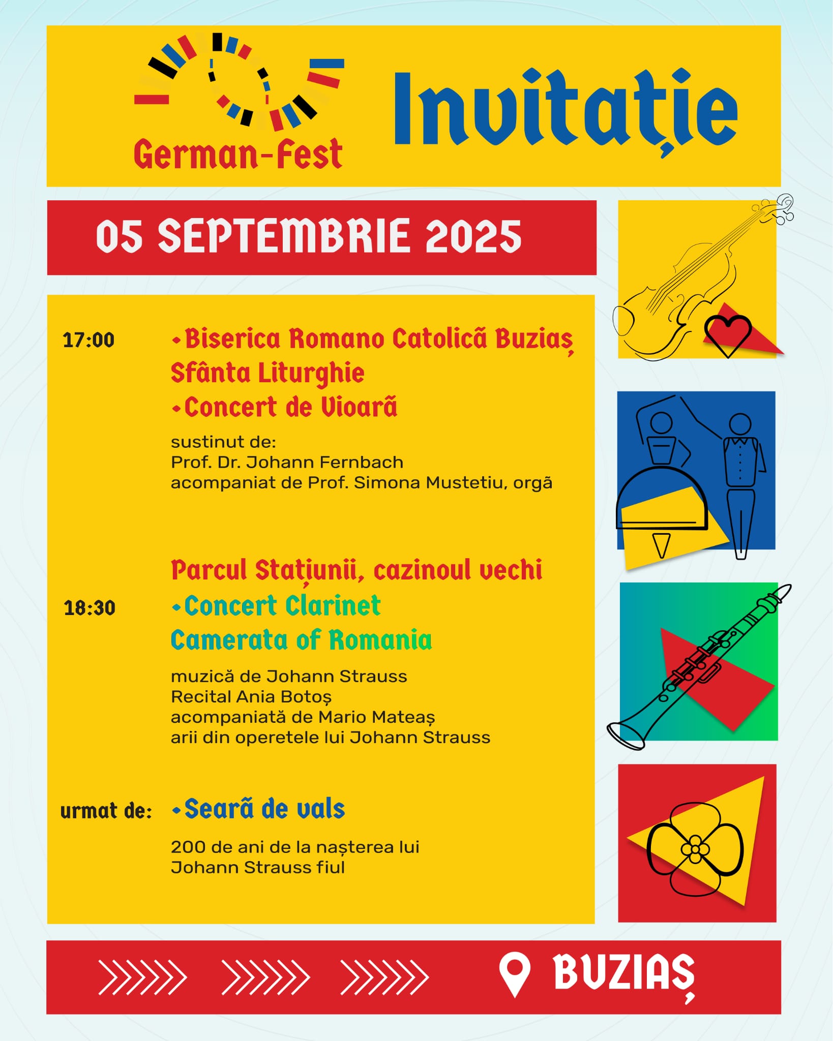 Pe 5 septembrie 2025, Buziașul va găzdui un eveniment cu totul special în cadrul German-Fest, ce va începe cu Sfânta Liturghie și va continua cu un program muzical de excepție. Programul va începe la ora 17:00 la Biserica Romano-Catolică din localitate, cu Sfânta Liturghie urmată de un concert de vioară susținut de Prof. Dr. Johann Fernbach, acompaniat de Prof. Simona Mustetiu la orgă.