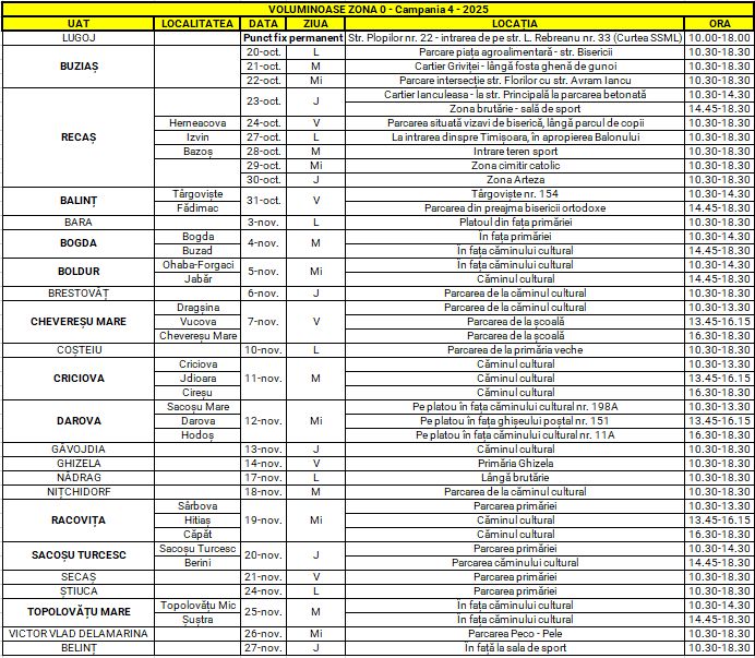 RETIM Ecologic Service S.A., în parteneriat cu ADID Timiș, lansează ce-a de a patra campanie trimestrială dedicată predării gratuite a deșeurilor voluminoase. În perioada 20 octombrie – 27 noiembrie 2025, în Zona 0 Ghizela, județul Timiș, locuitorii din Lugoj (un singur punct fix), Buziaș, Recaș (și în Herneacova, Izvin și Bazoș), Balinț (Târgoviște și Fădimac), Bara, Bogda (și în Buzad), Boldur (Ohaba – Forgaci și Jabăr), Brestovăț, Chevereșu Mare (și în Dragșina și Vucova), Coșteiu, Criciova (și în Jdioara și Cireșu), Darova (și în Sacoșu Mare și Hodoș), Găvojdia, Ghizela, Nădrag, Nițchidorf, Racovița (Sârbova, Hitiaș și Căpăt), Sacoșu Turcesc (și în Berini), Secaș, Știuca, Topolovățu Mare (Topolovățu Mic și Șuștra), Victor Vlad Delamarina și Belinț au ocazia să le predea legal și gratuit la containerele RETIM!