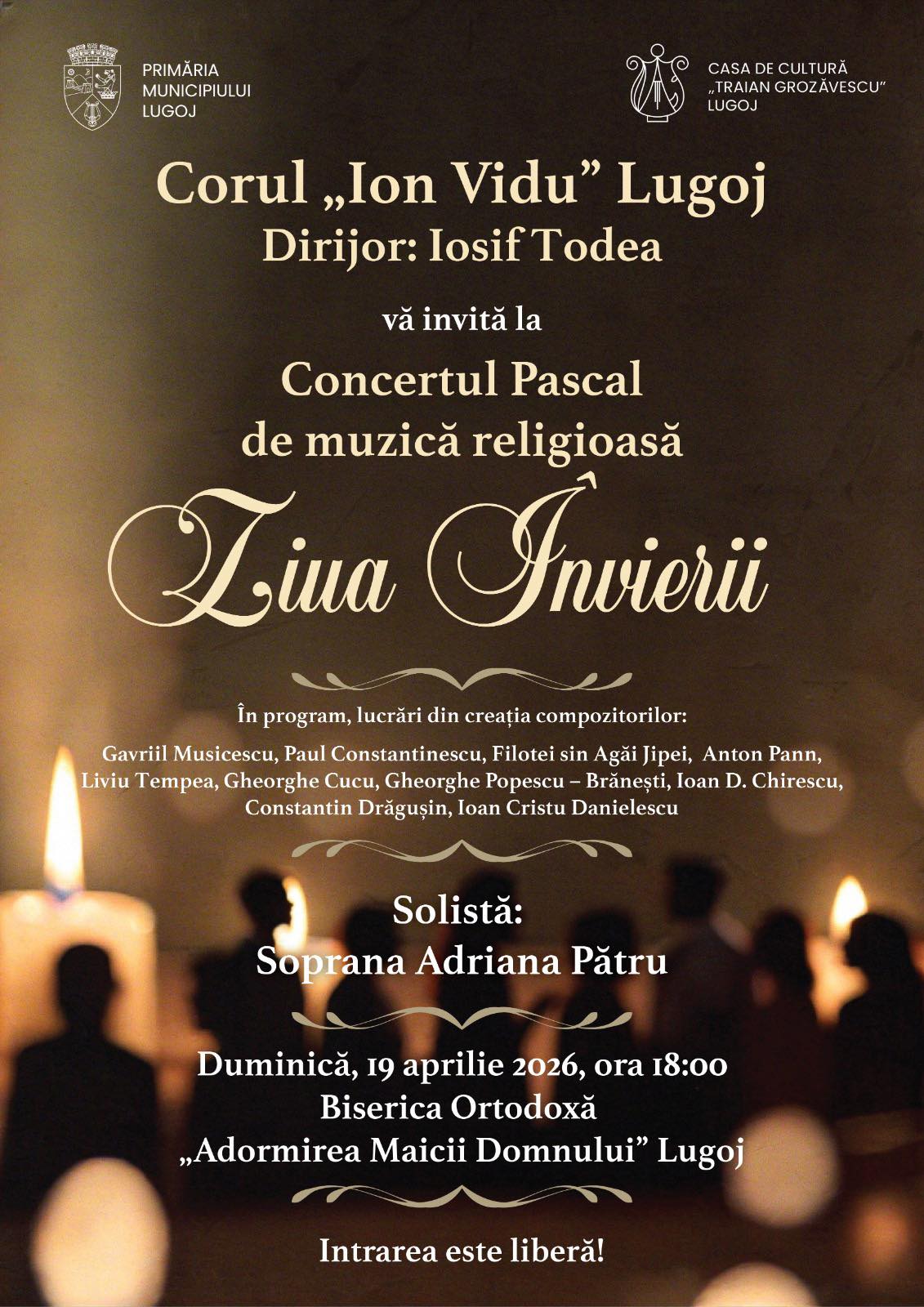 Reputatul Cor „Ion Vidu” continuă tradiția marilor concerte pascale, invitând publicul meloman la un eveniment de o înaltă ținută spirituală. Sub bagheta dirijorului Iosif Todea, ansamblul va susține concertul de muzică religioasă intitulat „Ziua Învierii”, duminică, 19 aprilie 2026, începând cu ora 18:00.