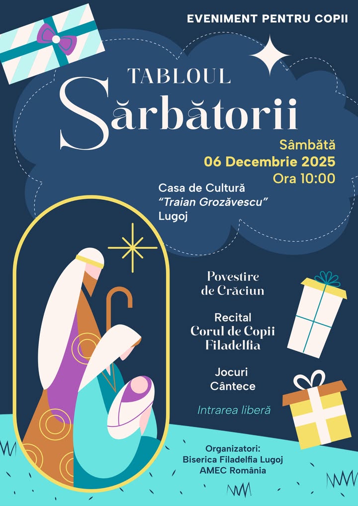 Copiii din Lugoj sunt invitați sâmbătă, 6 decembrie 2025, la un eveniment special de Crăciun organizat la Casa de Cultură „Traian Grozăvescu”, începând cu ora 10:00. Manifestarea, intitulată „Tabloul Sărbătorii”, este dedicată celor mici și promite o dimineață plină de voie bună și emoție.