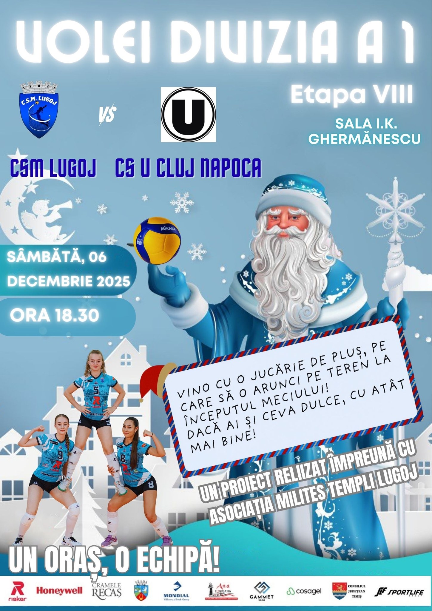 „VINE MOȘUL, VINE MOȘUL… Și suntem siguri că și voi o să fiți alături de el ca în fiecare an! Pentru că și acum, împreună cu prietenii noștri de la Asociația Milites Templi Lugoj, vor organiza o acțiune caritabilă pentru copii mai puțin norocoși din Lugoj și zonele învecinate, care au nevoie și ei de o bucurie de sărbători. Pentru ei vom aduna jucării și dulciuri, așa că dacă ai o jucărie de pluș vino cu ea să o arunci pe teren la începutul jocului. Și dacă ai și ceva dulce, primim și asta. La intrare vom avea o cutie unde strângem bunătățile de la voi. Anii precedenți ați fost foarte darnici, iar copii s-au bucurat de cadourile de la voi. Sâmbătă, 6 decembrie, de Moș Nicolae, te așteptăm la sală, la meciul cu Universitatea Cluj, de la 18,30. Când echipele vor fi la salut ne așteptăm la o ploaie de jucării! Ce spui, ești moșul nostru în acest an?”, au transmis reprezentanții CSM Lugoj – volei.