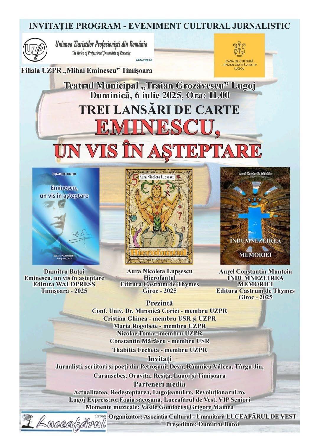 Duminică, 6 iulie 2025, începând cu ora 11:00, Casa de Cultură „Traian Grozăvescu” din Lugoj găzduiește un eveniment cultural jurnalistic organizat de Filiala Uniunii Ziariștilor Profesioniști din România (UZPR) „Mihai Eminescu” din Timișoara.