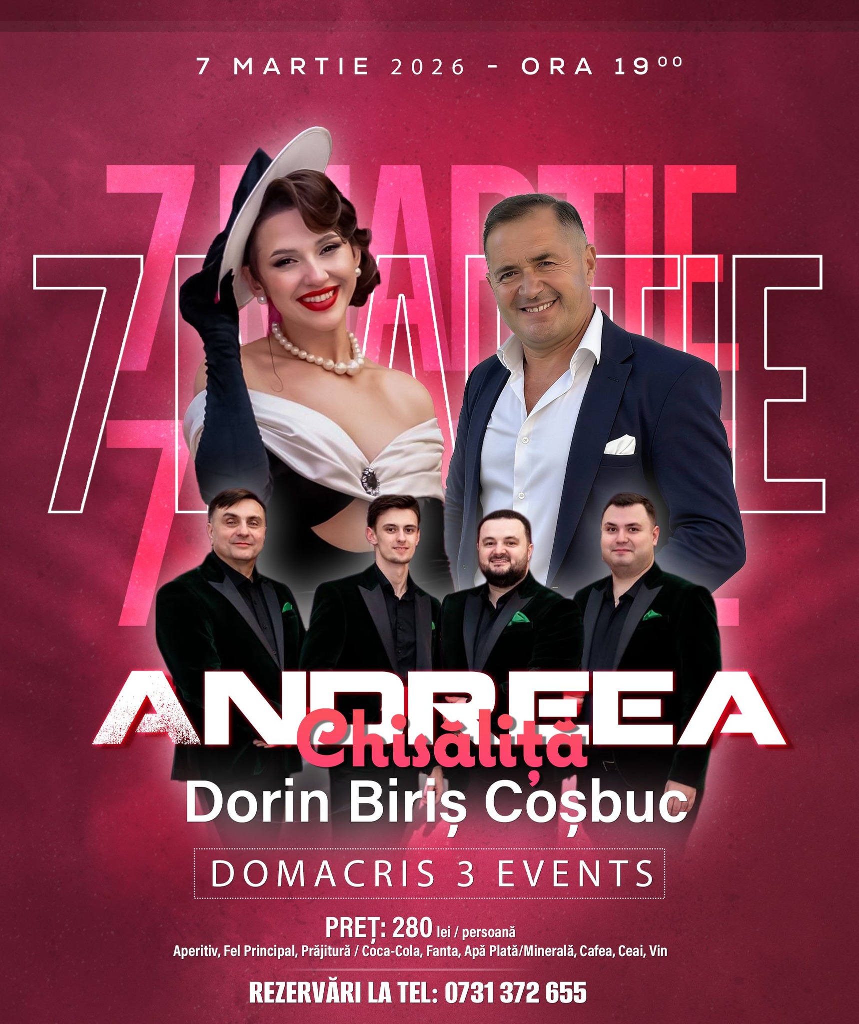 Cap de afiș al serii sunt Andreea Chisăliță și Dorin Biriș Coșbuc, alături de formația lor, care vor asigura muzica și buna dispoziție pe parcursul întregii petreceri.