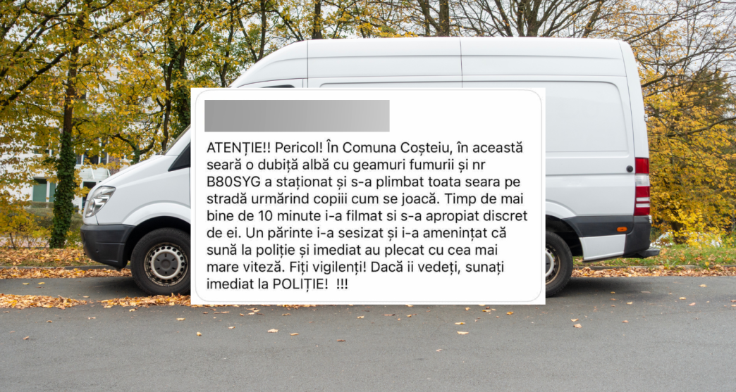 S-a întâmplat joi seara, în jurul orelor 21-22, la Coșteiu. Mesajul postat pe Facebook vorbește despre dubiță ca fiind albă și având geamuri fumurii. Mașina ar fi staționat și urmărit copiii cum se joacă. După ce un părinte i-ar fi amenințat cu poliția, duba a plecat din sat.