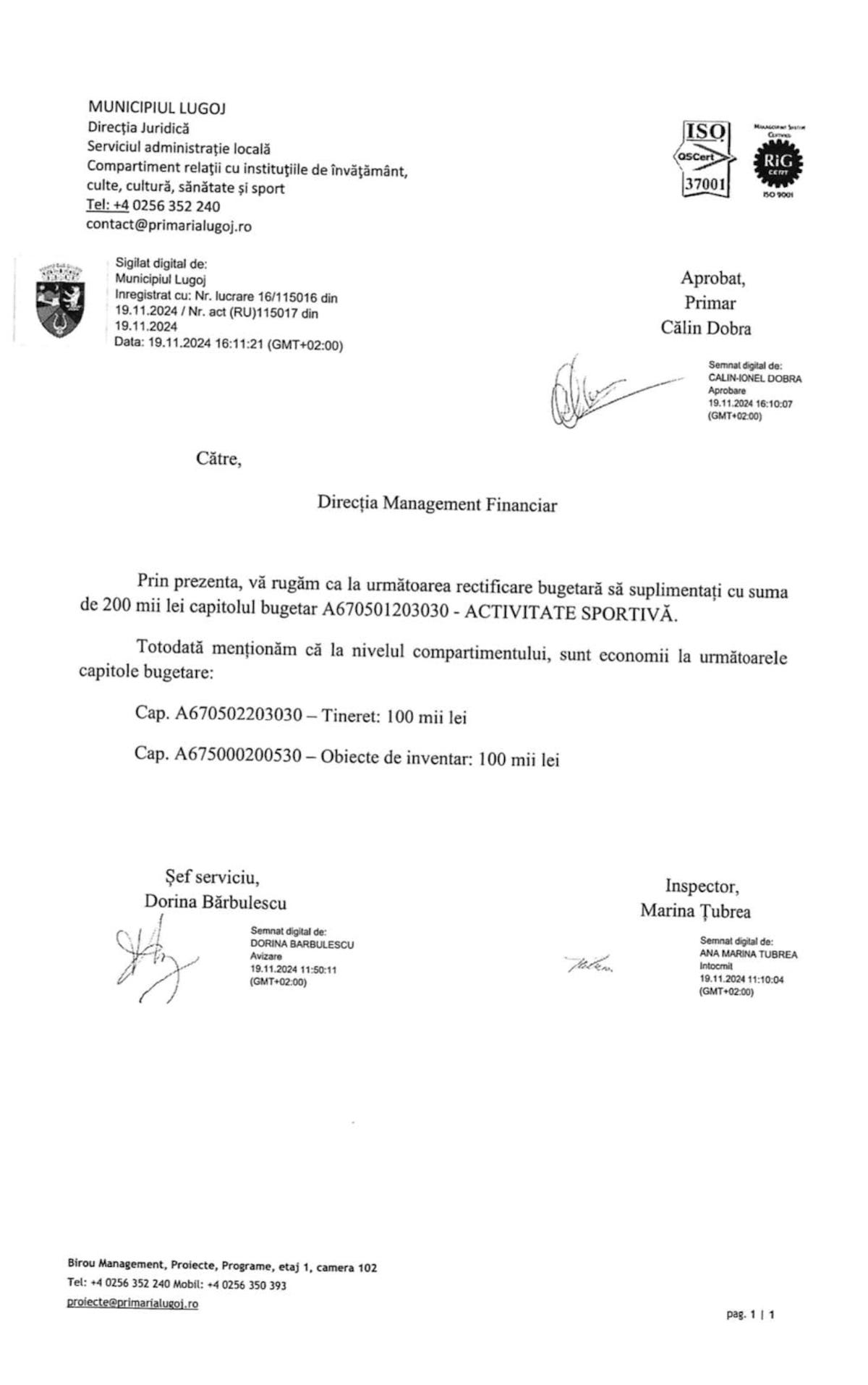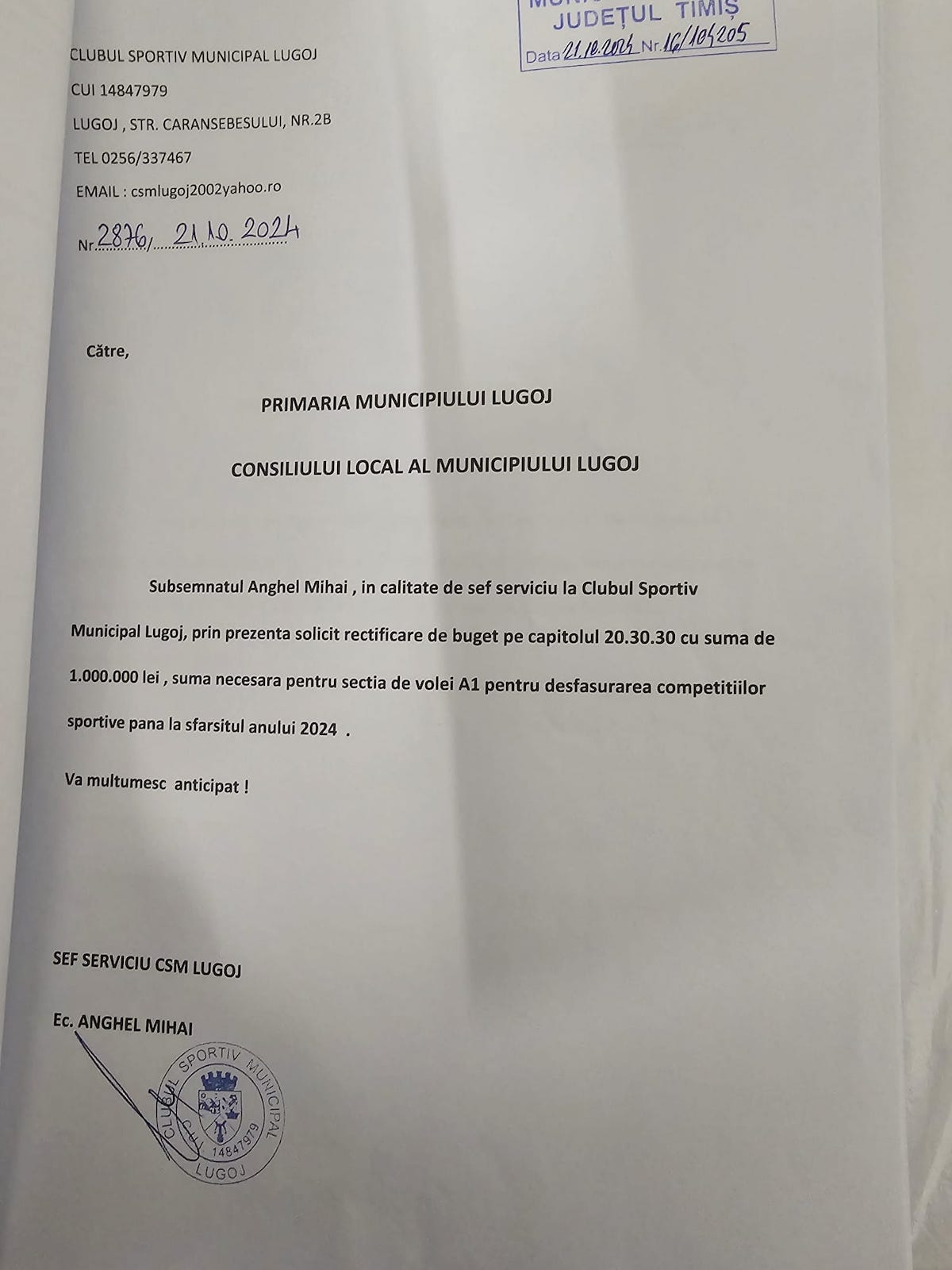 „Clubul Sportiv Municipal Lugoj a solicitat în data de 21.10.2024 (prin adresa înregistrată la Primăria Municipiului Lugoj sub numărul 2876) suma de 1.000.000 RON pentru acoperirea următoarelor nevoi:
