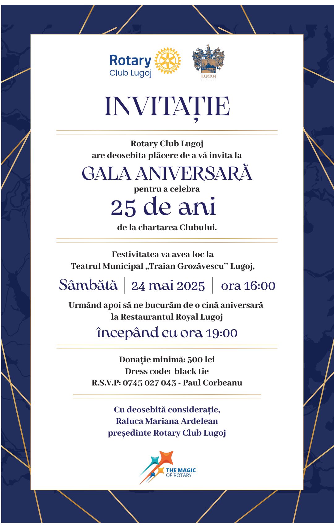 Clubul Rotary Lugoj marchează un moment important în activitatea sa comunitară, sărbătorind 25 de ani de la cartare. Evenimentul aniversar va avea loc sâmbătă, 24 mai, începând cu ora 16:00, la Teatrul Municipal „Traian Grozăvescu” din Lugoj, și va continua cu o cină festivă la Restaurantul Royal, de la ora 19:00.