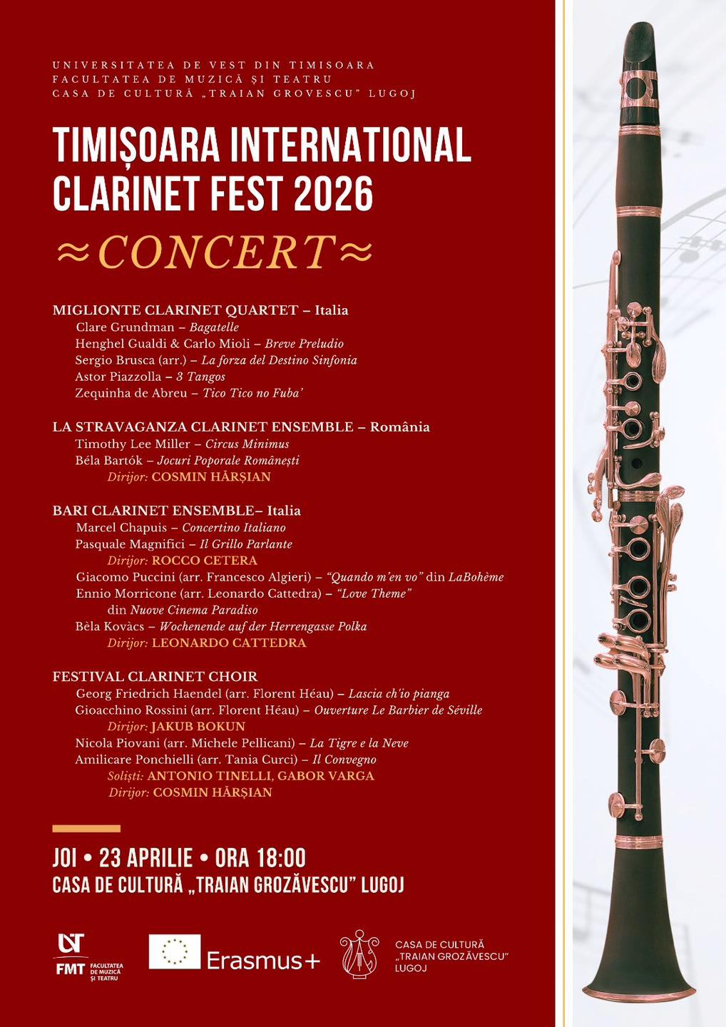 Casa de Cultură „Traian Grozăvescu” devine joi, 23 aprilie 2026, gazda unui eveniment muzical de anvergură europeană. În cadrul programului Timișoara International Clarinet Fest 2026, Facultatea de Muzică și Teatru din cadrul UVT aduce la Lugoj un regal sonor ce reunește artiști de prestigiu din Italia, Polonia, Ungaria, Elveția și România.