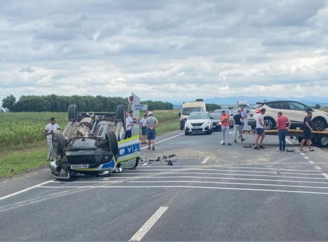 FOTO UPDATE Accident grav la ieșirea din Belinț spre Lugoj. O autospecială a poliției, implicată în eveniment