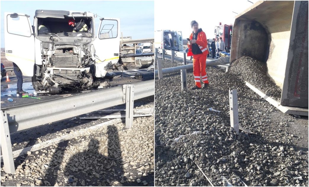 Totodată, 30 de minute mai târziu, un autocamion s-a răsturnat în sensul giratoriu de pe A1 de la Holdea. Potrivit DRDP Timișoara, la această oră se circulă îngreunat în zona autoaccidentării.