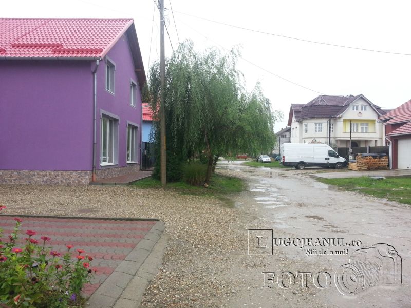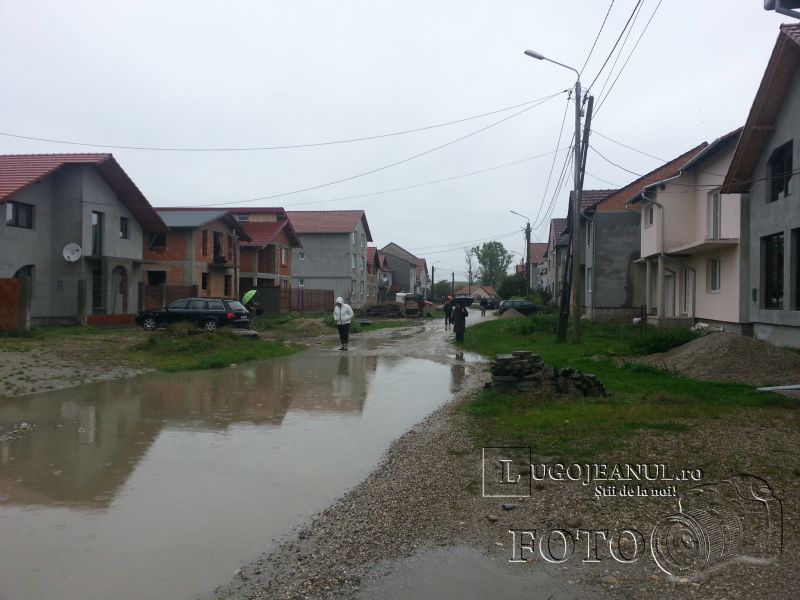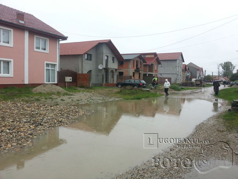 20131002_112736Lugojenii care locuiesc pe strada G.A. Petculescu, situată în cartierul Balta Lată, se confruntă de câțiva ani cu o problemă care nu pare să aibă rezolvare. De fiecare dată când plouă, pe toată suprafața străzii apar belți de dimensiuni impresionante, care fac dificilă trecerea autoturismelor sau a bicicletelor pe drumul neasfaltat. Se pare că, după ani și ani de ploi și ninsori, pământul de pe porțiunea de drum fără asfalt s-a lăsat și a format gropi de zeci de metri lățime, unde se adună apa după orice ploaie, fie ea ușoară sau puternică.