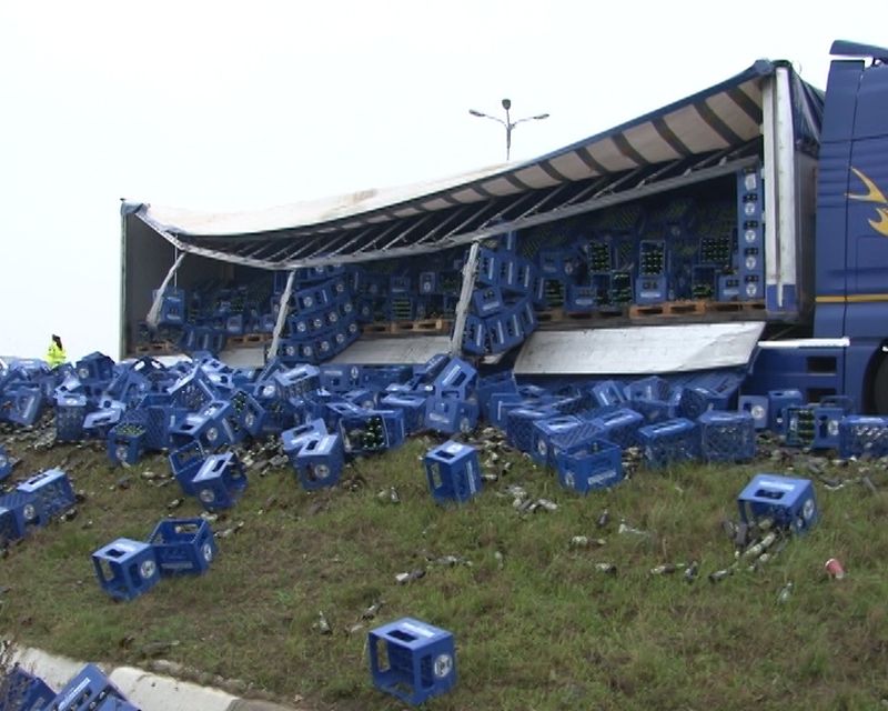 TIR-ul era plin pana la refuz de bere Ciucas si se indrepta spre Timisoara, venind dinspre Alba. Camionul de 30 de tone a ramas fara jumatate de incarcatura, dupa ce aceasta s-a rupt si a ajuns in sant. Politistii vor stabili acum modul in care s-a produs incidentul.