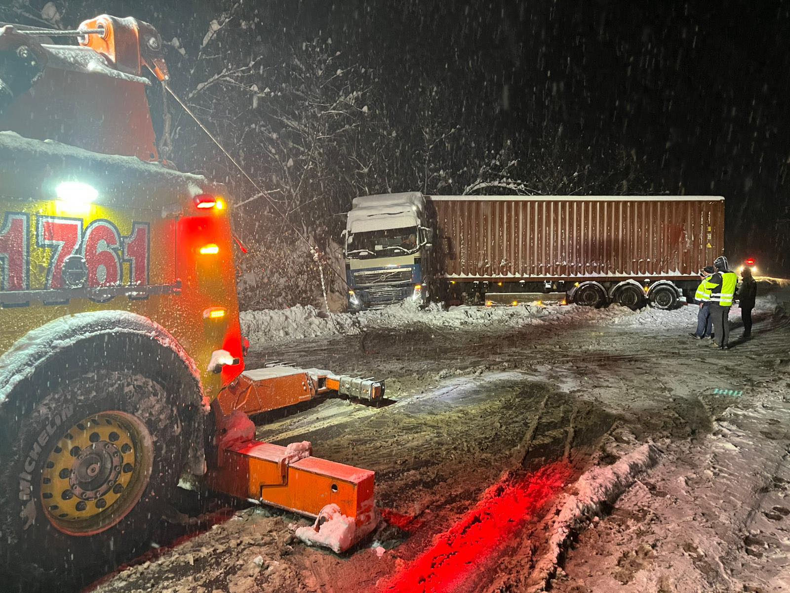 Direcția Regională de Drumuri și Poduri (DRDP) Timișoara a anunțat, în cursul nopții, că traficul se desfășoară alternativ și exclusiv pentru autoturisme, în timp ce echipele intervenea pentru tractarea vehiculului de mare tonaj. Reprezentanții DRDP au precizat că autotrenul nu era echipat corespunzător pentru condiții de iarnă.