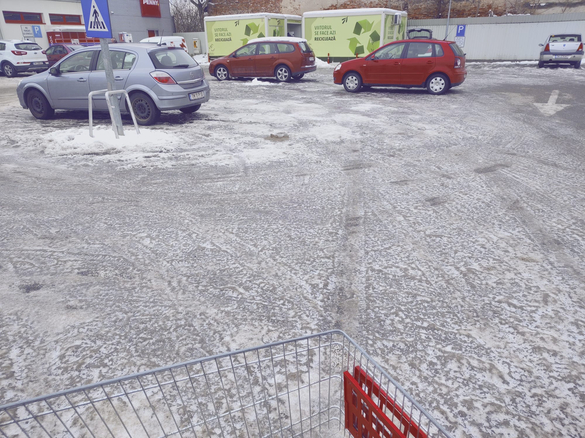 Pentru mulți lugojeni, cea mai mare problemă nu este neapărat intrarea în magazin, ci drumul de la ușă până la mașină. Împingerea căruciorului cu cumpărături pe o suprafață alunecoasă pare să fi devenit o activitate extremă, rezervată celor cu simț al echilibrului bine dezvoltat.