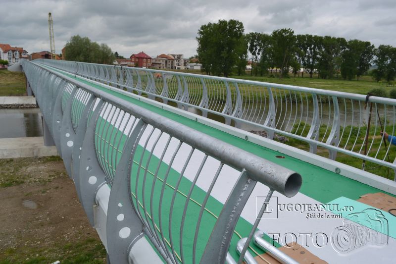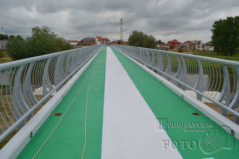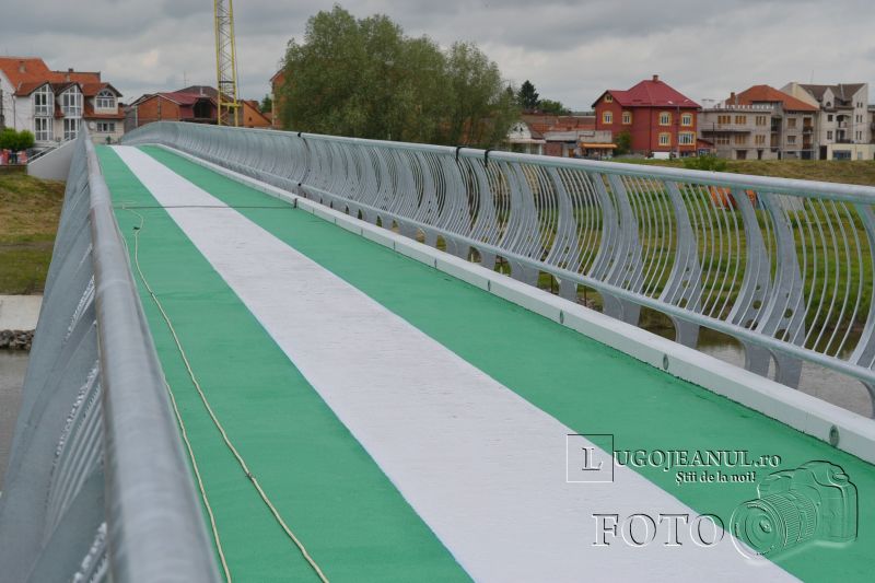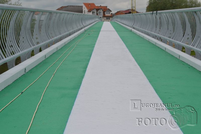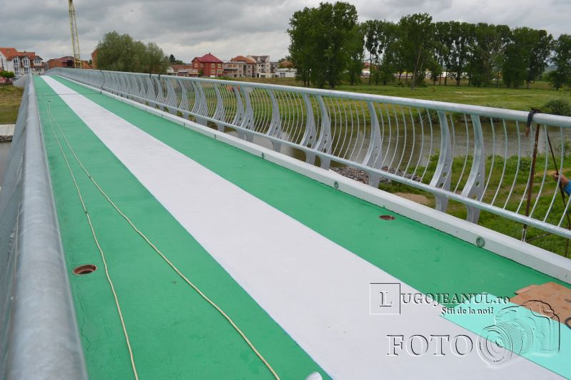 La mai puțin de două săptămâni până la inaugurare, podul pietonal de peste Timiș este finisat în aceste zile de către muncitori, care au realizat astăzi vopsirea acestuia cu un strat protector de bitum special, colorat în verde și alb. Cele trei linii marchează trecerea pentru pietoni cu alb și trecerile pentru bicicliști, pe o parte și pe cealaltă, cu verde. Podul pietonal va face de miercuri, 21 mai, legătura pentru lugojeni dintre cartierul Ștrand și zona pieței agroalimentare „George Coșbuc” de pe partea cealaltă de râu.