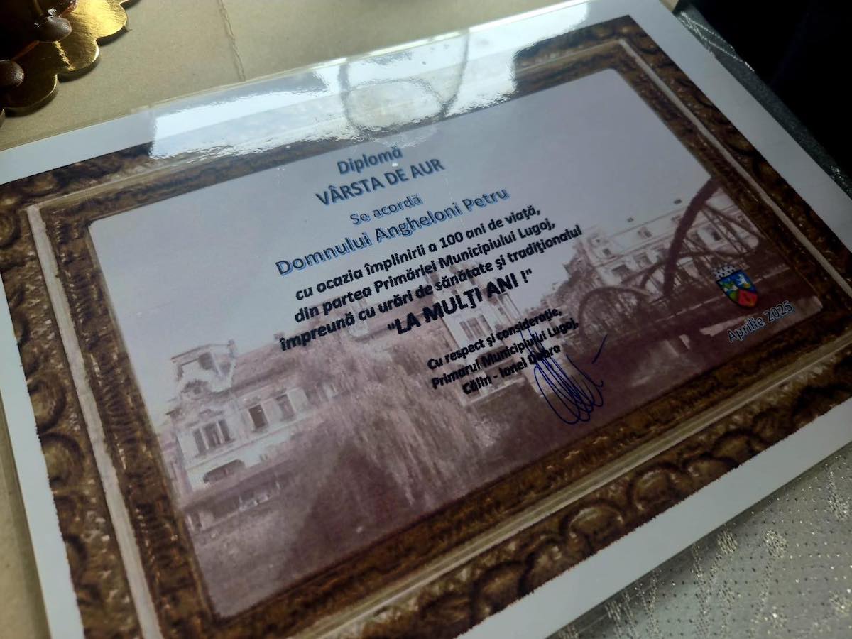 Un lugojean a împlinit zilele trecute 100 de ani! Pentru „isprava” sa, primăria orașului i-a înmânat o distincție, primarul fiind cel care a și schimbat câteva vorbe cu centenarul sărbătorit, pe numele lui Petru Angheloni. Acesta a povestit că să iubești munca este extrem de important pentru o viață bună și lungă.