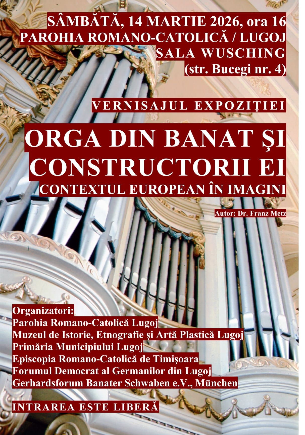 Lugojenii sunt invitați sâmbătă, 14 martie 2026, de la ora 16:00, la vernisajul expoziției „Orga din Banat și constructorii ei. Contextul european în imagini”, un eveniment dedicat patrimoniului muzical și istoric al regiunii.