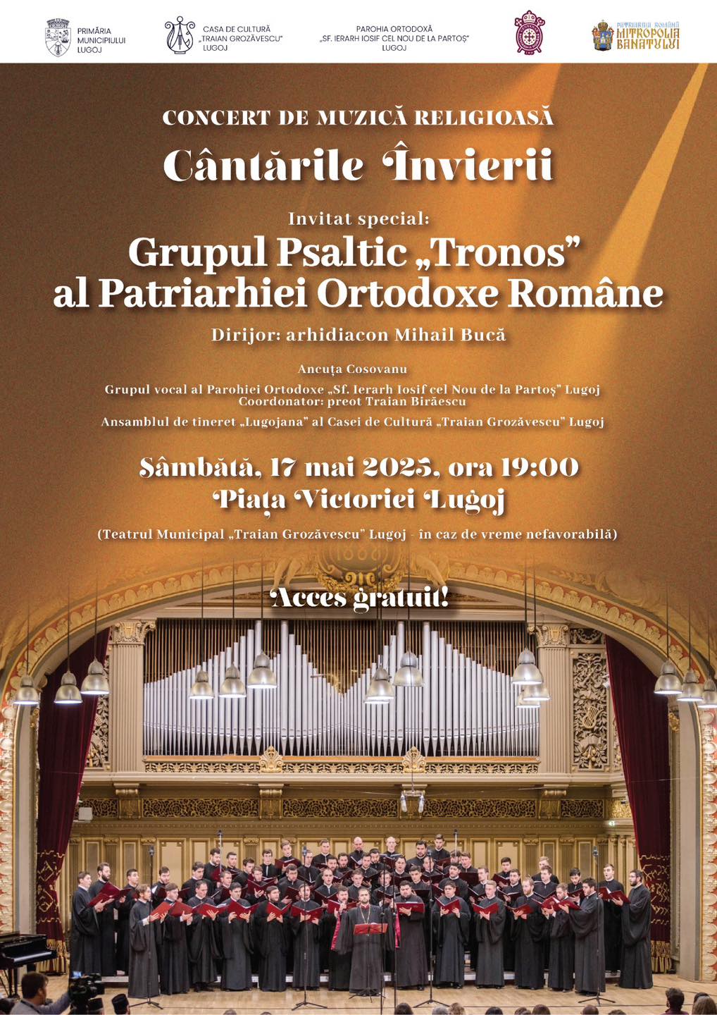 Sâmbătă, 17 mai 2025, de la ora 19:00, Piața Victoriei din Lugoj va găzdui un eveniment de excepție: concertul „Cântările Învierii”, susținut de renumitul Grup Psaltic „Tronos” al Patriarhiei Române, dirijat de arhidiaconul Mihail Bucă.