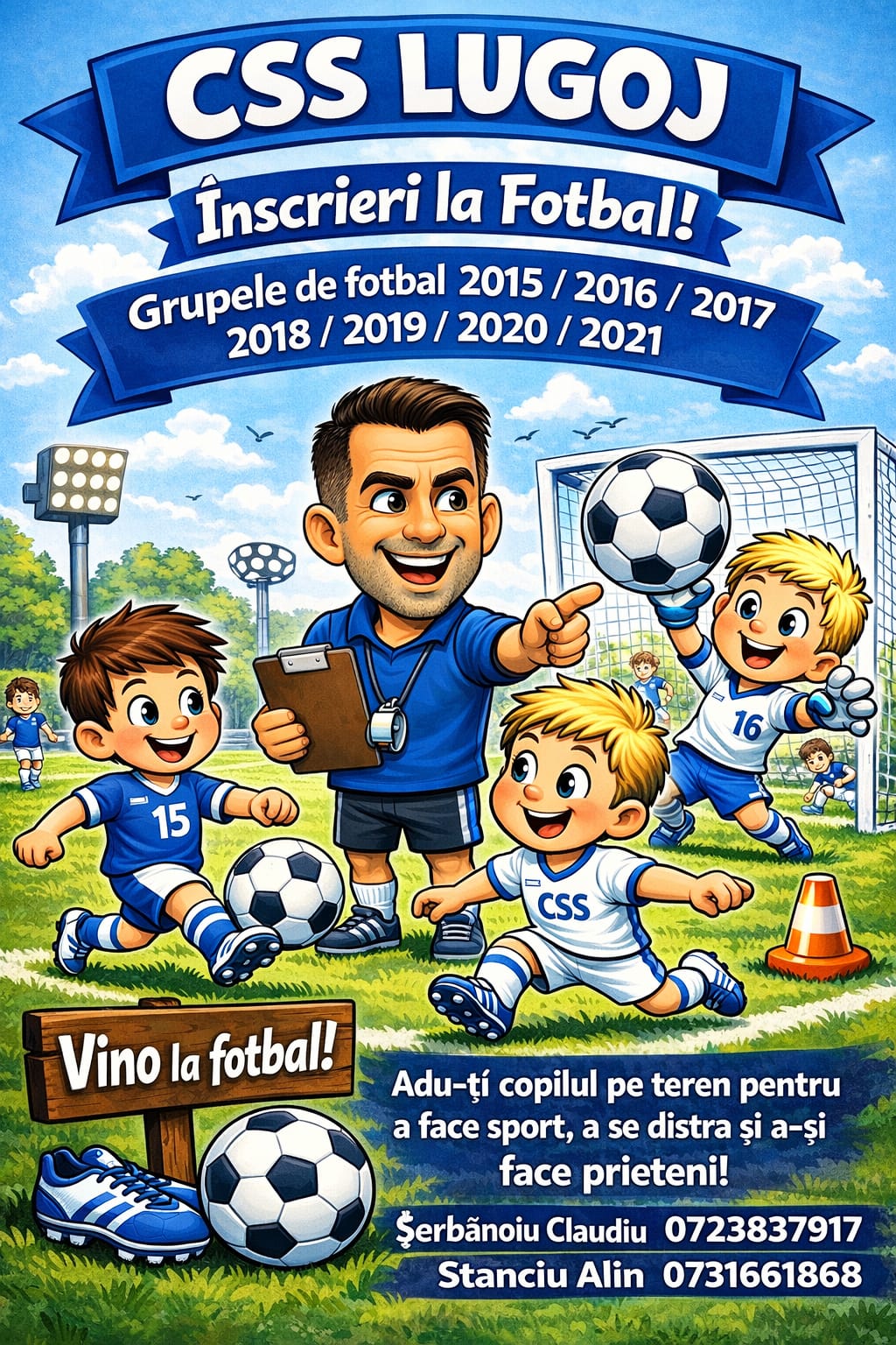 Vești bune pentru părinții din Lugoj: Clubul Sportiv Școlar Lugoj a deschis înscrierile pentru grupele de fotbal dedicate copiilor născuți între 2015 și 2021, oferindu-le celor mici ocazia să facă mișcare și să descopere sportul încă de la vârste fragede.