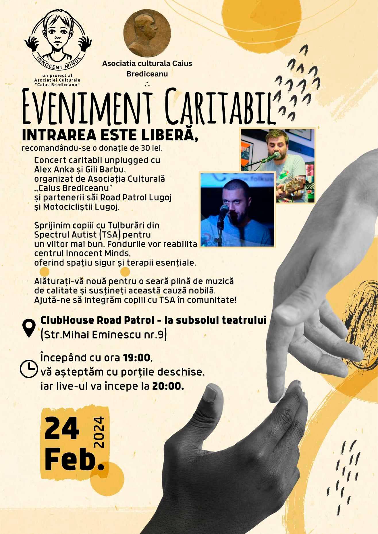 Asociația Culturală Caius Brediceanu, în parteneriat cu Road-Patrol MC Lugoj și Motocicliștii Lugoj, vă invită să vă alăturați evenimentului caritabil desfășurat sâmbătă, 24 februarie, la Clubhouse Road Patrol MC Lugoj. Alex Anka și Gili Barbu vor fi protagoniștii unui concert unplugged, oferindu-le tuturor celor prezenți ocazia de a se bucura de muzică și de a contribui la un scop nobil.