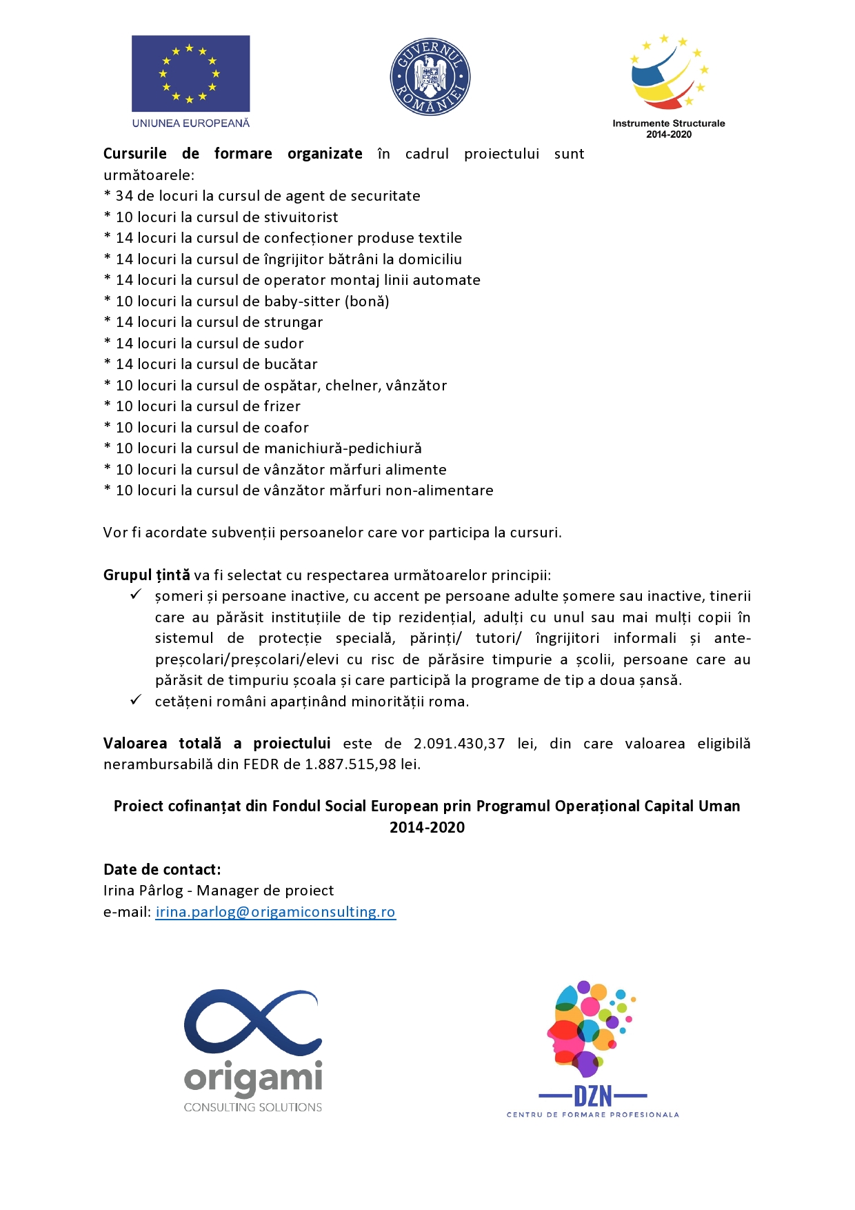 ORIGAMI CONSULTING SOLUTIONS SRL, în calitate de beneficiar, implementează proiectul “ACCES PE PIAȚA MUNCII ÎN COMUNITĂȚILE DEFAVORIZATE DIN LUGOJ” – SMIS 155216, în parteneriat cu DZN SECURITY SERVICES SRL, în baza contractului de finanțare POCU/717/5/1/155216 încheiat cu MINISTERUL INVESTIȚIILOR ȘI PROIECTELOR EUROPENE, în calitate de Autoritate de Management, reprezentată prin Organismul intermediar regional pentru Programul operațional sectorial pentru dezvoltarea resurselor umane – Regiunea Vest.