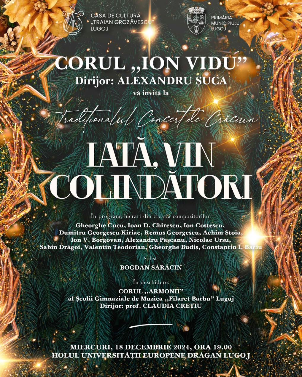 Cel mai important cor al orașului îi invită pe lugojeni la cel mai așteptat eveniment de acest gen al anului. Primăria Municipiului Lugoj și Casa de Cultură „Traian Grozăvescu” Lugoj vă invită la Tradiționalul Concert de Crăciun al Corului „Ion Vidu”, dirijat de Alexandru Șuca.