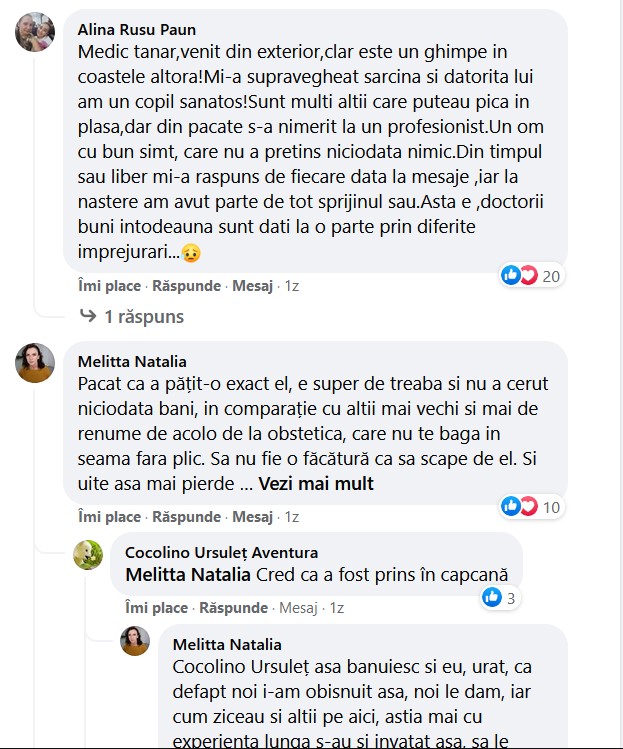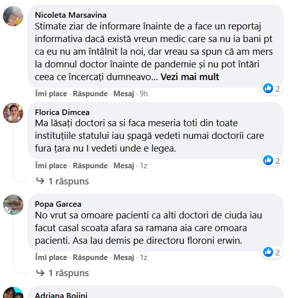 „Stimate ziar de informare înainte de a face un reportaj informativa dacă există vreun medic care sa nu ia bani pt ca eu nu am întâlnit la noi, dar vreau sa spun că am mers la domnul doctor înainte de pandemie și nu pot întări ceea ce încercați dumneavoastră sa scoateți in evidență! Pot spune că este un medic care merita tot respectul, nu il aștepți cu orele pe coridor ca alți, nu știu cine il sapă dar este evident că a deranjat pe cineva!”