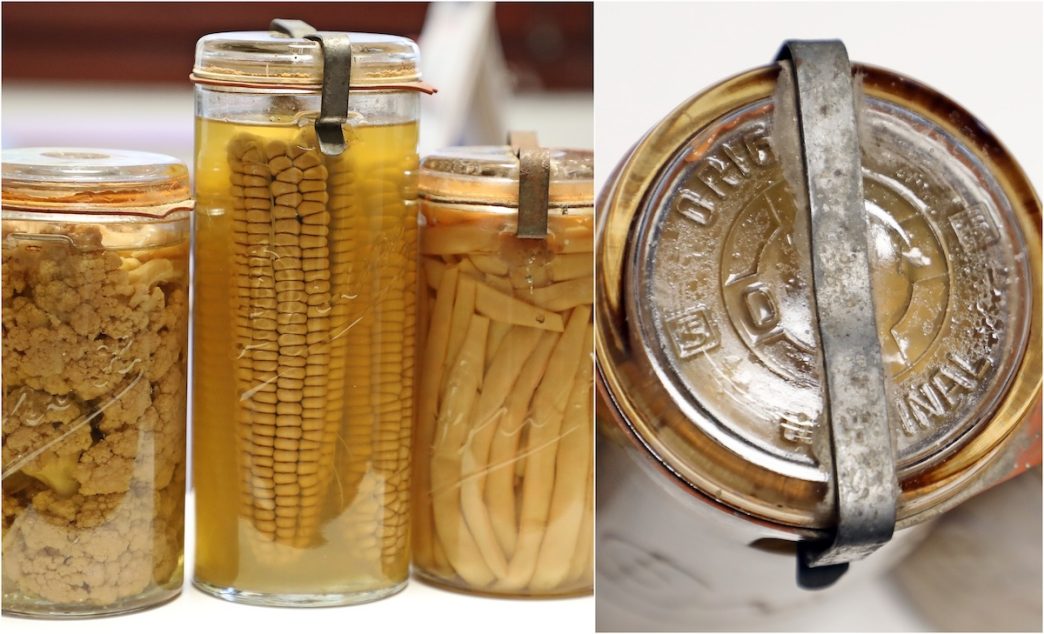 Borcanele sunt închise cu capace marca DUX, o marcă de lux din perioada interbelică, cunoscută pentru calitatea sistemului de închidere. Potrivit relatărilor proprietarului, căruia îi mulțumim din suflet, conservele au peste 100 de ani, estimare confirmată și de colegii noștri, care le datează în anii 1920.