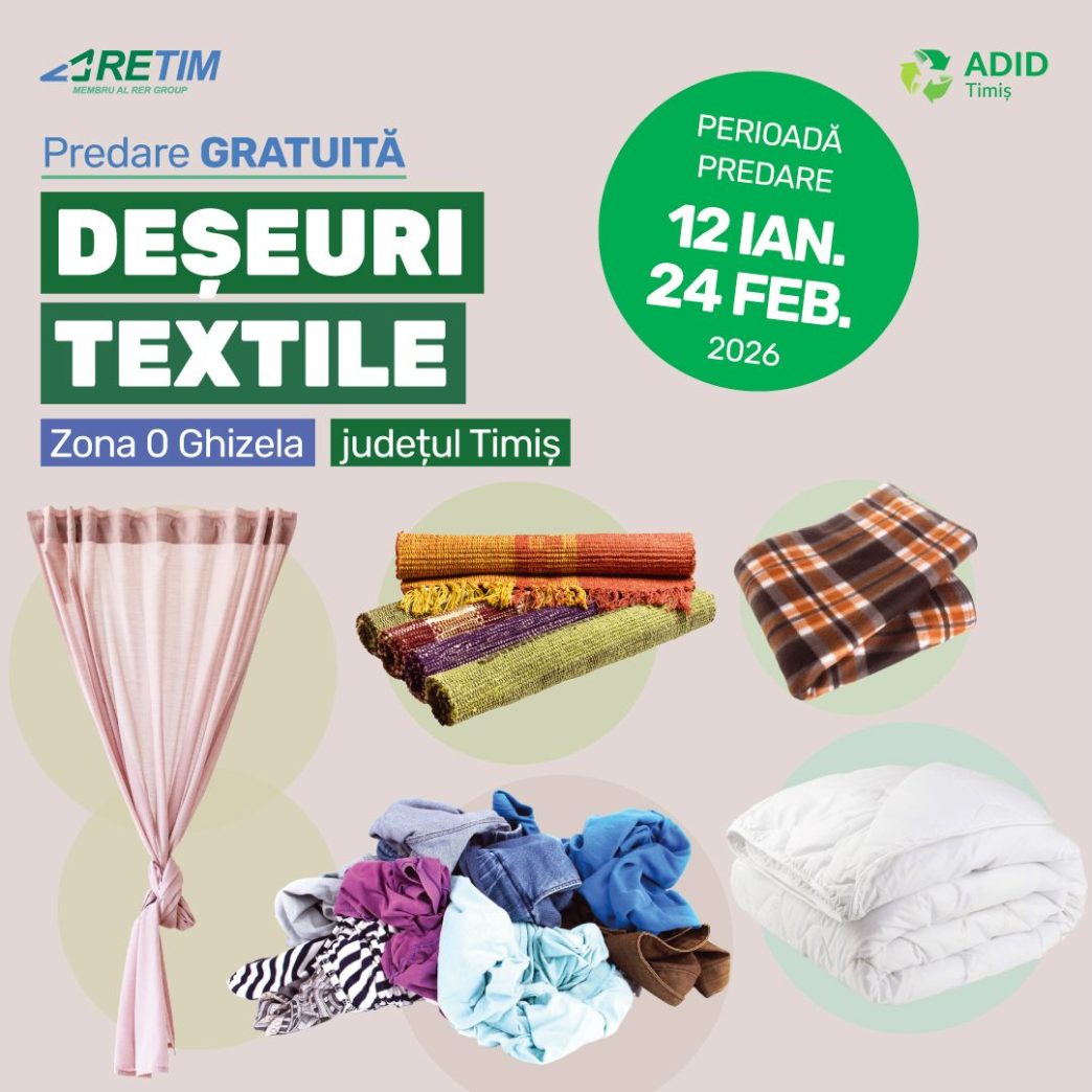 RETIM Ecologic Service S.A., în parteneriat cu ADID Timiș, anunță prima campanie trimestrială din 2026 de colectare a deșeurilor textile, în Zona 0 Ghizela, jud. Timiș. În perioada 12 ianuarie – 24 februarie utilizatorii casnici din localitățile: Lugoj, Buziaș, Recaș, Balinț, Bara, Bogda, Boldur, Brestovăț, Chevereșu Mare, Coșteiu, Criciova, Darova, Găvojdia, Ghizela, Nădrag, Nițchidorf, Racovița, Sacoșu Turcesc, Secaș, Știuca, Topolovățu Mare, Victor Vlad Delamarina și Belinț, pot beneficia de această oportunitate pentru a se debarasa legal și GRATUIT de deșeurile textile din gospodărie.