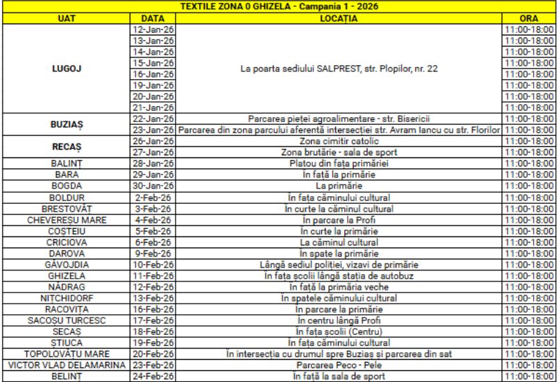 Utilizatorii casnici din localitățile menționate pot preda gratuit, prin aport voluntar, deșeurile textile la punctele de colectare stabilite, conform programului din tabelul* de mai jos: