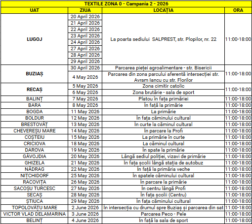 Utilizatorii casnici din localitățile menționate pot preda gratuit, prin aport voluntar, deșeurile textile la punctele de colectare stabilite, conform programului din tabelul* de mai jos: