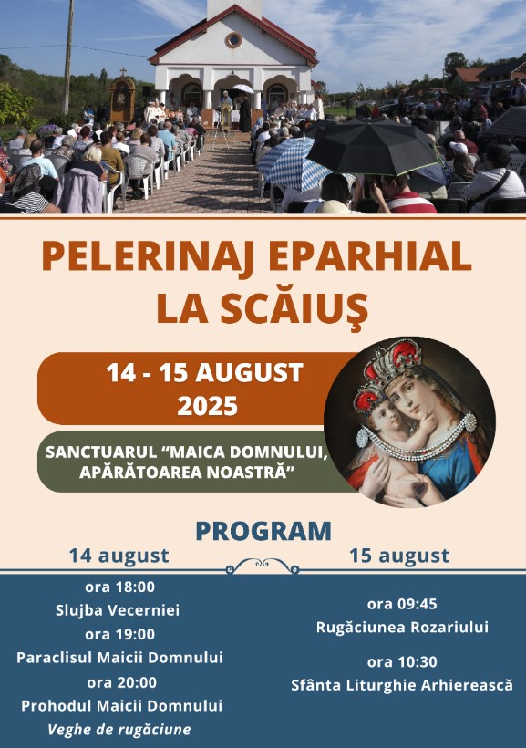 Episcopia Greco-Catolică de Lugoj invită credincioșii să participe la Pelerinajul Eparhial organizat cu ocazia sărbătorii „Adormirea Maicii Domnului”, supranumită și Paștele verii. Evenimentul va avea loc la Sanctuarul „Maica Domnului Apărătoarea Noastră” din Scăiuș, unde se comemorează 91 de ani de la fenomenul lăcrimării icoanei Maicii Domnului, un eveniment considerat autentic și verificat canonic.