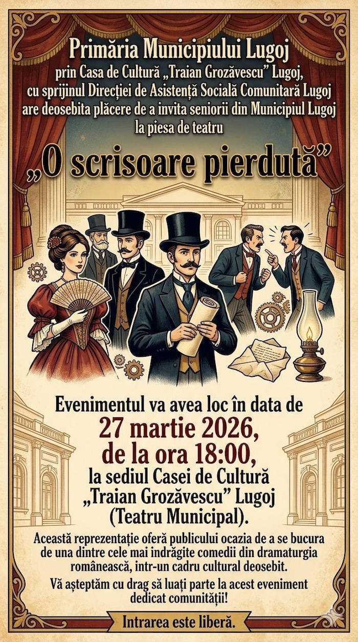 Evenimentul este programat pentru 27 martie, începând cu ora 18:00, și va avea loc în sala Teatrului Municipal Lugoj. Spectacolul este oferit exclusiv seniorilor din municipiu, ca semn de apreciere pentru contribuția lor în comunitate.