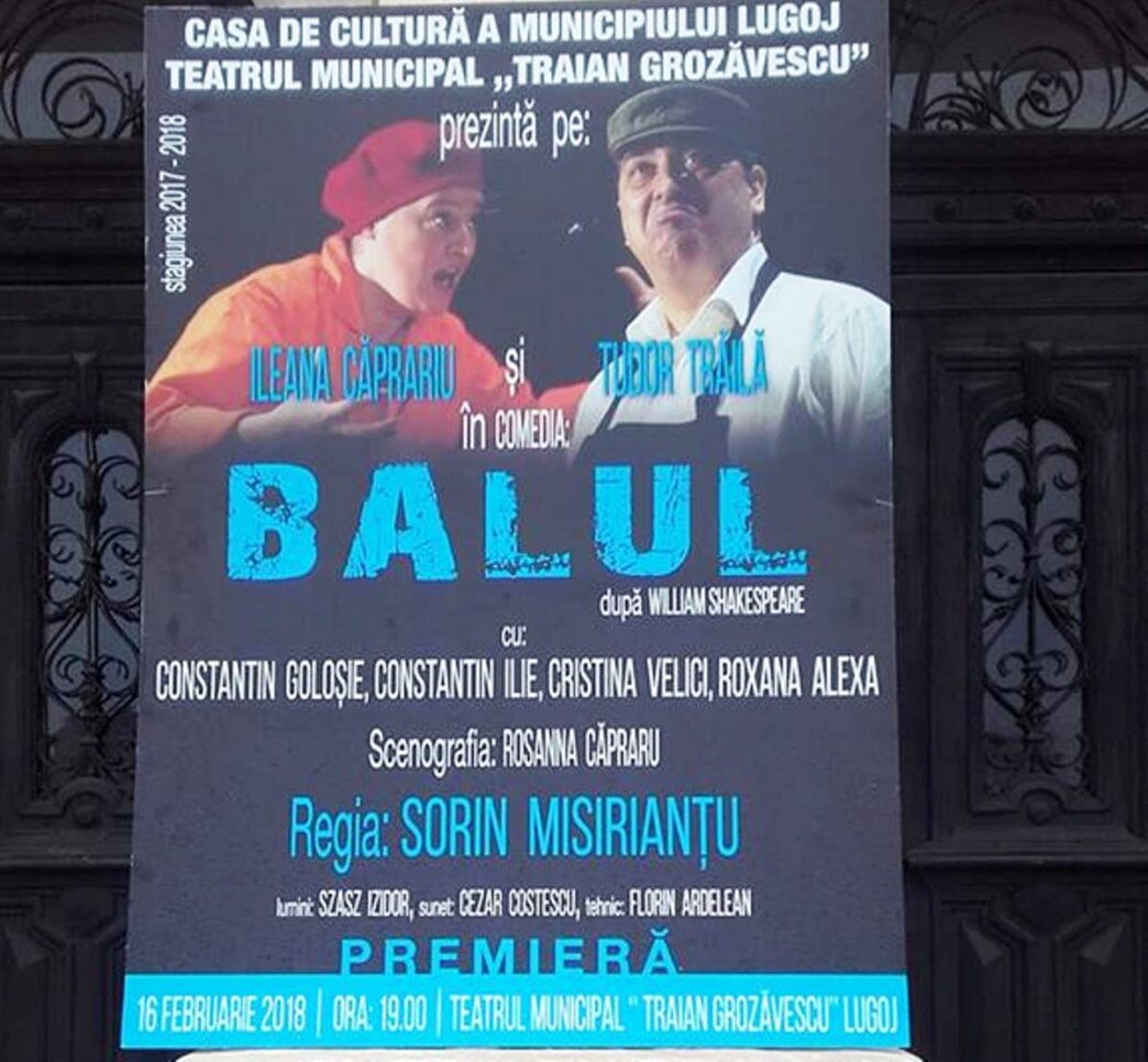 Iubitorii de comedie sunt invitați vineri, 16 februarie, ora 19, la Teatrul Municipal „Traian Grozăvescu” din Lugoj, la spectacolul cu piesa „Balul”. Inspirat din ,,Visul unei nopți de vară” al marelui dramaturg William Shakespeare, regizorul Sorin Misirianțu a scris un scenariu picant, plin de energie umană și l-a încredințat actorilor lugojeni. Din distribuție fac parte: Ileana Căprariu, Tudor Trăilă, Constantin Goloșie, Constantin Ilie, Cristina Velici și Roxana Alexa. Scenografia este semnată de Flavia Rosana Căpraru.